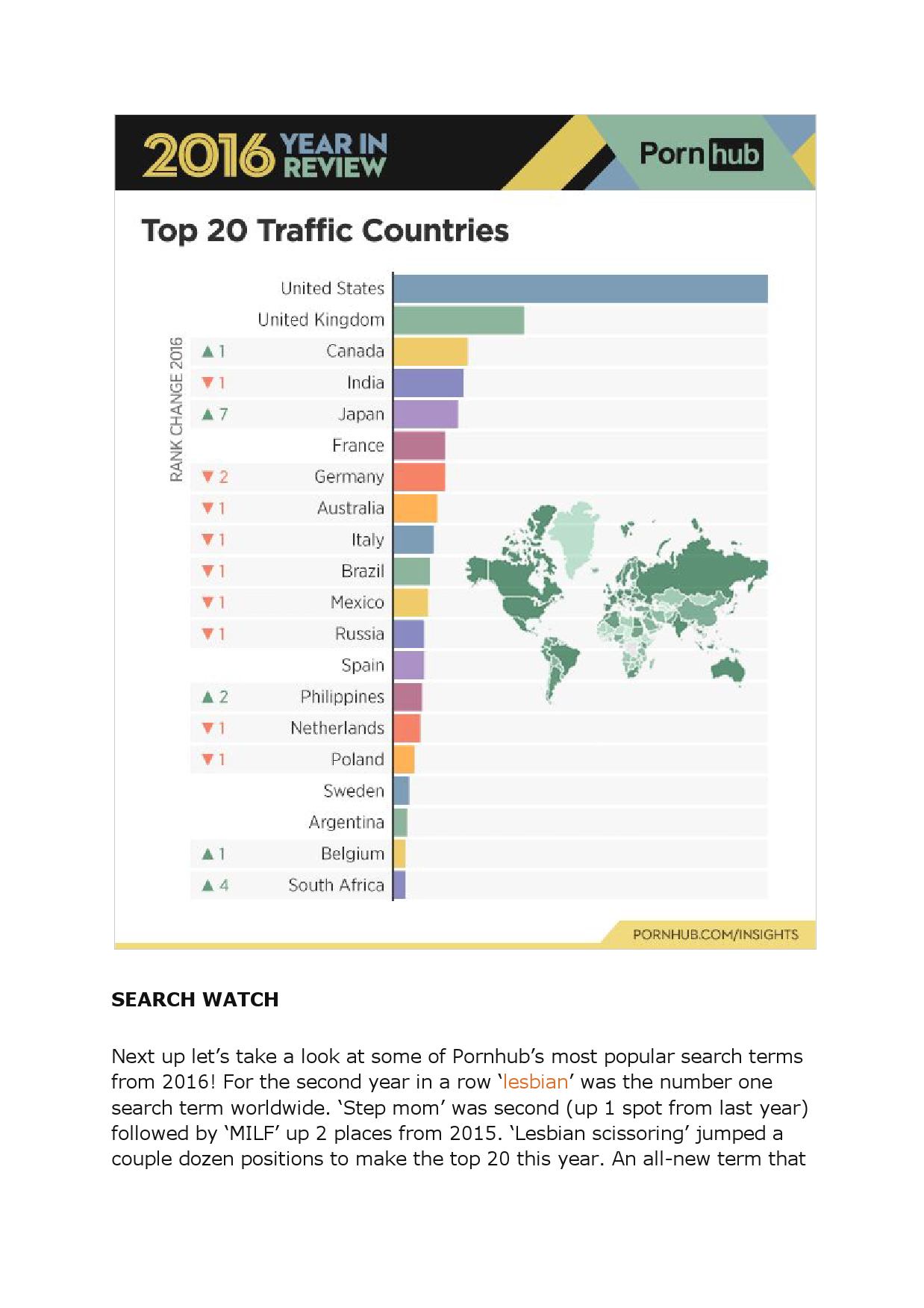 1、平均全球每人看了12.5部片,总时长5200多世纪。搜索词前三甲是lesbian, step mom和MILF(守望先锋排11)。美国观看量最高的类别是Lesbian,俄国是Anal,中国是Hentai。美英法澳瑞典比利时南非pornstar搜索前三甲都是金卡戴珊, Mia Khalifa和Lisa Ann。