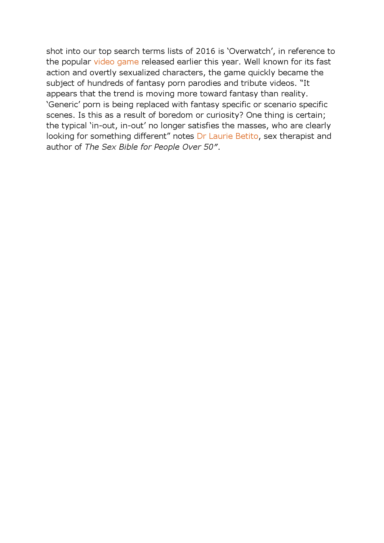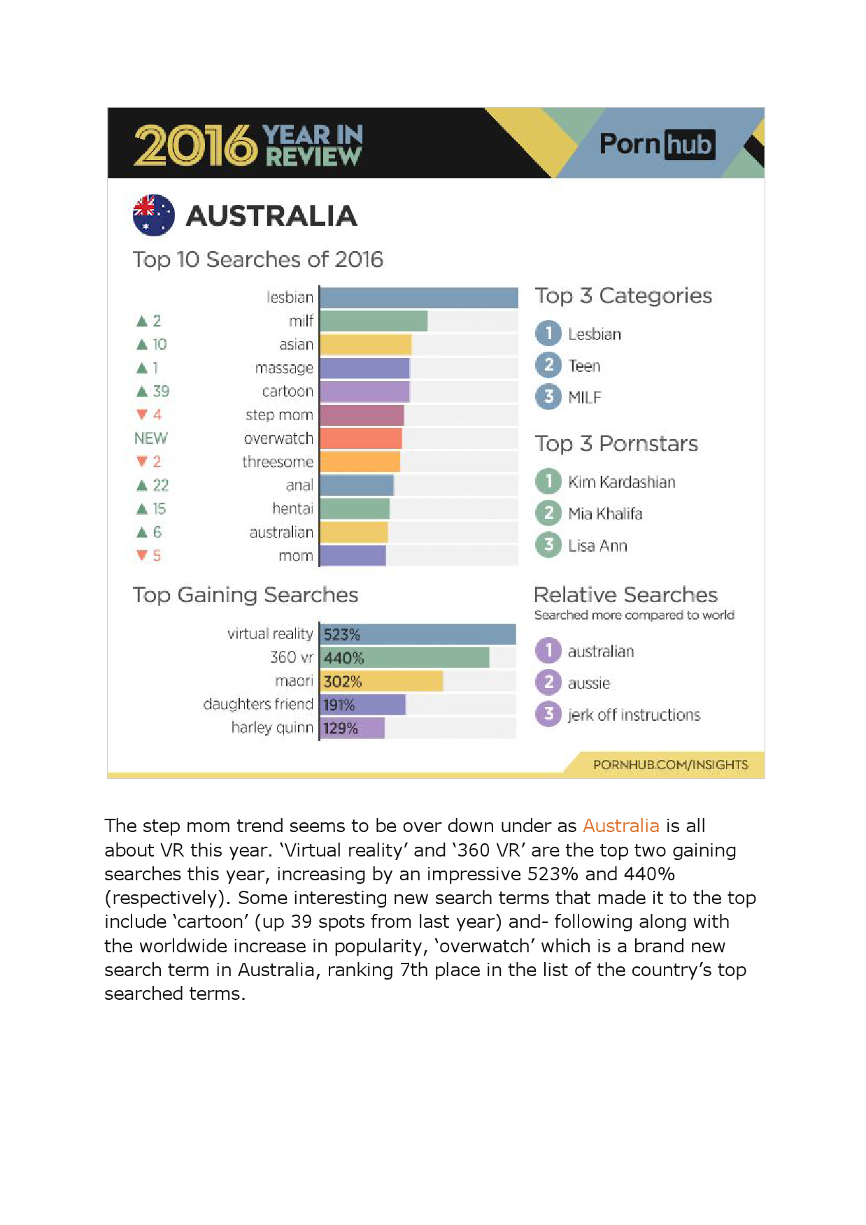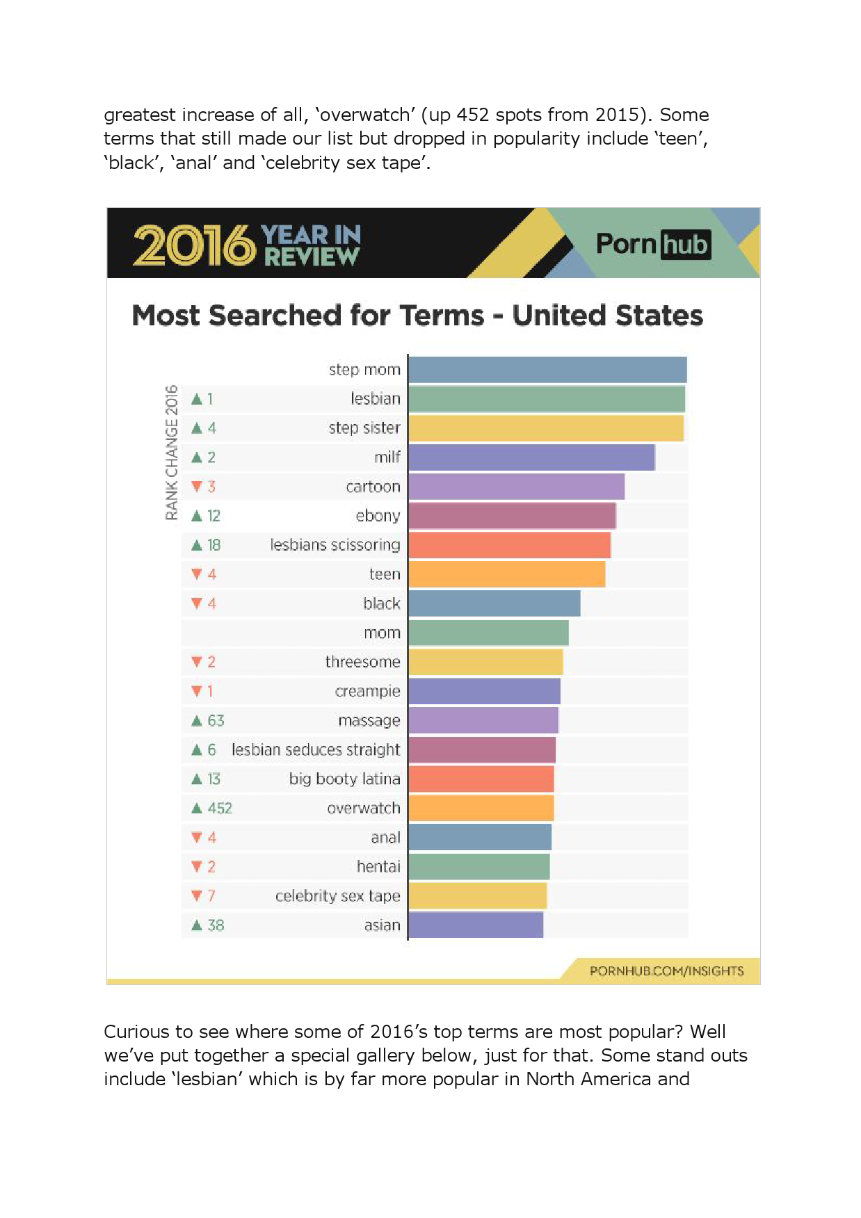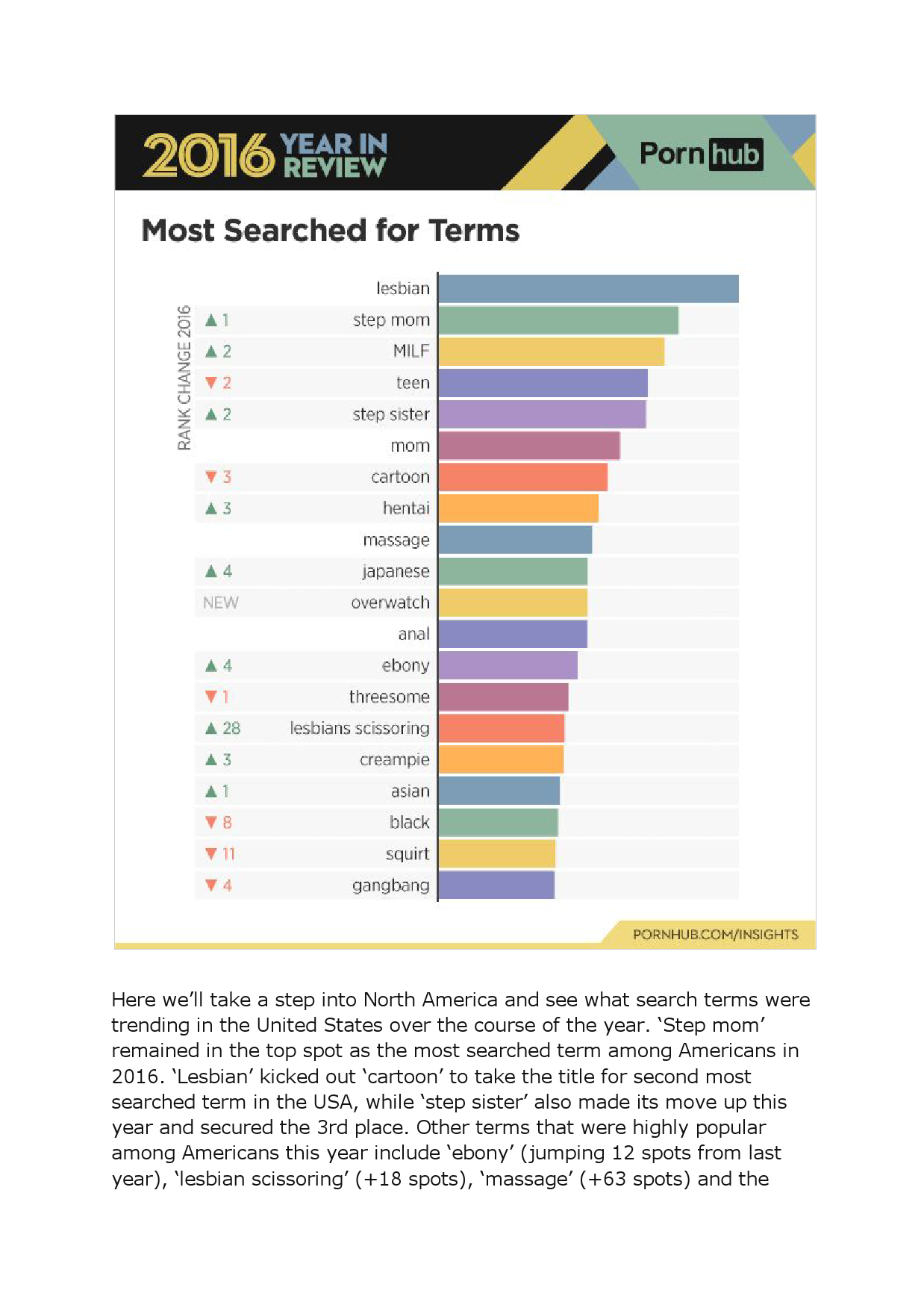 7、18-24岁年龄组最爱类别是lesbian, step sister, teen, hentai, MILF和step mom,全年增长最多的搜索关键词是守望先锋,增长了833%。