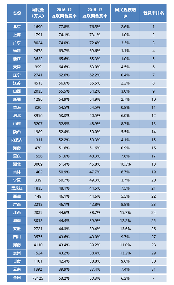 截至2016年12月,中国大陆31个省、自治区、直辖市中网民数量超过千万规模的为26个,与2015年持平。其中,网民规模增速排名靠前的省份为江西省和安徽省,增长率分别为15.7%和13.6%。