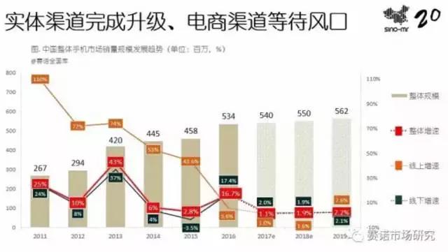2016年是手机市场渠道巨变之年,表现在三方面,一是线下渠道增速六年来首次超越线上;二是线上渠道增速大幅下降,从2015年的43.6%降至5.6%;三是线下渠道增速大幅提升,从2015年的-3.5%升至17.4%。