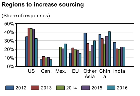 与此同时,更多受访者表示将在中国、印度、其他亚洲国家以及墨西哥加大采购业务,而美国、欧盟和加拿大等发达国家和区域不再如往年那么受青睐。比如,2016年,只有32%的受访者表示将在美国增加采购业务,这一数字在2015年是44%。