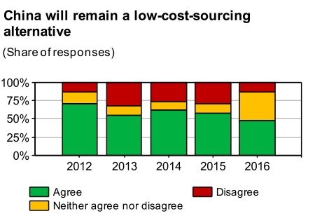 报告提到,虽然被越来越多的受访者认为是重要的采购地,但是中国不再像以往那样被普遍认为是一个廉价的采购地。2012年的调查显示70%的受访者把中国视为廉价商品采购地,但是这一比例到2016年已经大幅下降到50%以下。