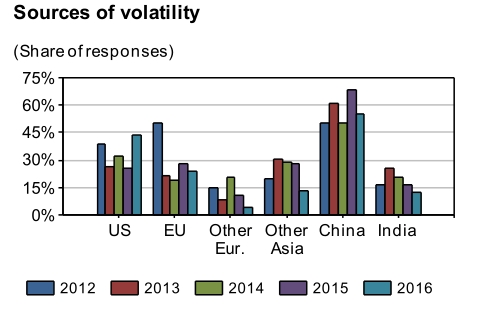 除此之外,认为欧盟和欧盟外其他国家是波动性来源的受访者比例从39%下降到2016年的28%,印度和其他亚洲国家的比例则从2013年的56%下降到2016年的26%。
