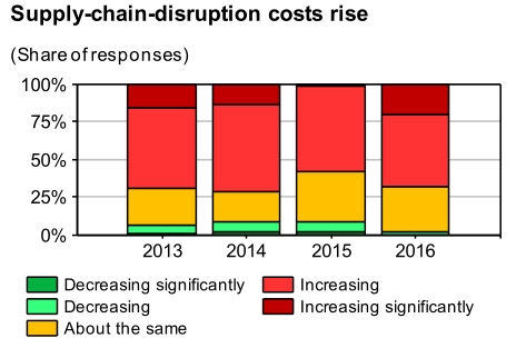 报告指出,2/3的受访者认为供应链断裂的代价越来越大,其中19%的受访者认为这部分财务成本显著增加。值得注意的是,在2015年的调查中,仅有1%的人非常重视供应链断裂的代价。相对地,2016年的调查结果中,只有2%的人认为供应链断裂的代价正在减小。