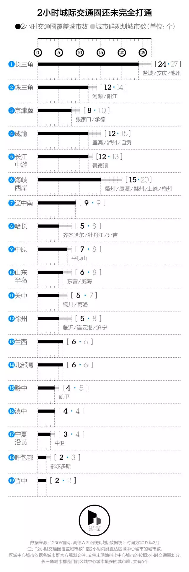 当一个周边城市能够在2小时之内,通过高速公路或高铁到达城市群内部的区域中心城市,新一酱即视其为是已进入2小时交通圈范围之内的城市;反之,它则被排除在了整个城市群的快速交通网之外。
