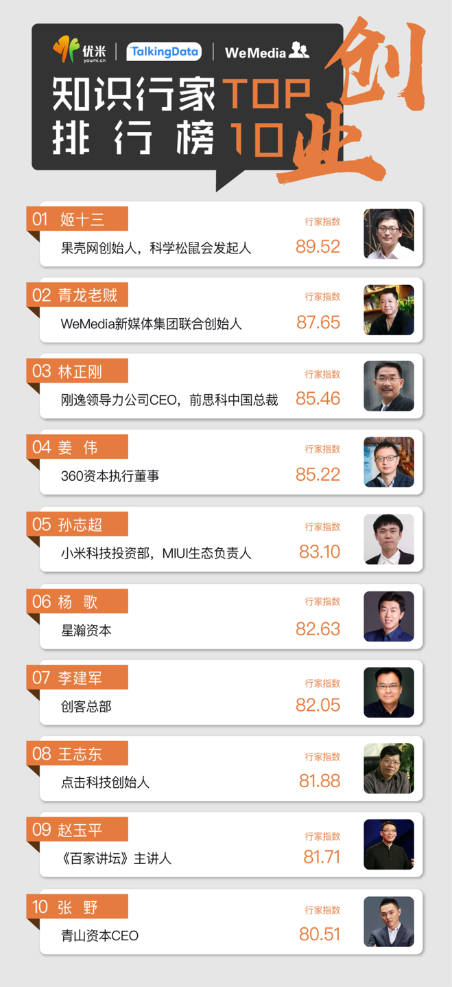 排行榜数据基于优米、喜马拉雅等知识分享平台,百度、新浪微博、微信等公开网络平台,从知识专业度、网络影响力和行业潜力多方位,综合计算得出创业、大数据、自媒体三个类别的知识行家Top50。
