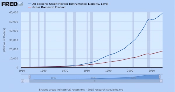 下图显示,自1970年来,美国社会负债水平就以超GDP增速的速度增长。