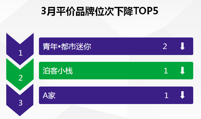 本月排名下降的品牌中,青年·都市迷你下降两个位次;泊客小栈与A家都下降1位。