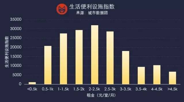 3,租金4K元/房间/月是一个重要的临界值,假如你囊中羞涩,不得不在这个标准上少支付12%(差不多是500块钱),那么平均看来,你所能享受到的生活便利程度将大幅度降低接近40%,生活的残酷由此可见。