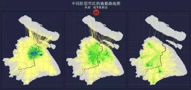 从左至右,分别对应中心城区内居民、外环到新外环(沈海高速-申嘉湖高速环)内的居民、以及五个新城居民的通勤路线。可以看到: