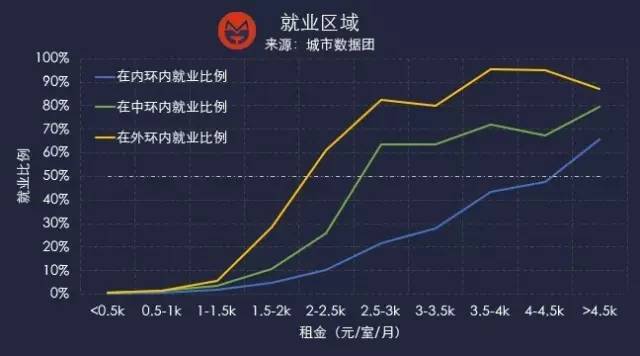3, 租金在4-4.5k元/房间/月以上的阶层,超过一半的人工作在内环线以内的市中心。
