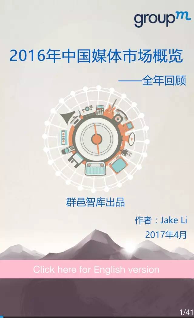 中国媒体市场概览2016全年回顾 在群邑智库最新的中国媒介市场概览中您可以看到如下满满的干货: 1. 中国媒介市场趋势概览总结 2. 宏观经济与政策法规 3. 各媒体表现评估 4. 互联网潜力领域 更多阅读:中国媒体市场概览(2015全年回顾)在中国,只抓一个权健是不够的Crunchbase:2018年中国初创企业已经获得938亿美元投资2016年中国记者职业生存状态与工作习惯调查报告企鹅智酷:2018中国媒体消费趋势露营天下:2016中国露营地行业报告京东:2016中国电商消费行为报告2016上半年中国手机消费者需求研究中国私人银行2016:逆势增长 全球配置2017年11月中国新能源汽车销量11.9万辆ZDC:2016上半年中国机箱产品市场研究2018年东南亚、中国和印度经济展望:通过数字化促进增长复旦大学&清华大学:2016中国劳动力市场技能缺口研究2016年上半年度中国招商加盟领域数据研究2016年度中国招商加盟领域数据研究