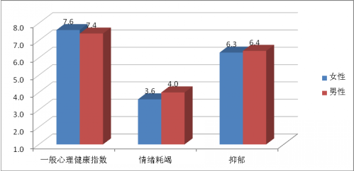 通过调查分析发现,女性员工整体的身心健康水平均高于男性。而男性在情绪耗竭和抑郁上则表现出更多的问题。这与男性员工实际工作压力、社会舆论压力以及男性员工普遍不善倾诉和表达密不可分。