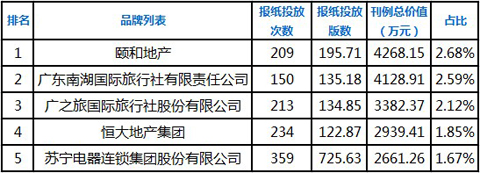 梅花网近日对2012年第二季度广东,山东,江苏,浙江,福建的报纸广告主做了一次梳理。据梅花网监测数据显示:在2012年4月1日—2012年6月30日期间,在广东报纸广告主监测中,颐和地产位居第一。与第一季度相比,国美电器依然表现不俗,在山东的投放是排名第一,在浙江是处于第三的位置上,而在福建是排名第二。