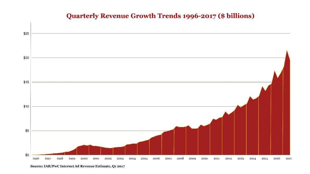 IAB:2017年Q1美国网络广告收入达196亿美元 199IT原创编译 根据IAB发布的最新数据,2017年第一季度,美国网络广告收入达到196亿美元,同比增长23%。 仅次于2016年第四季度(216亿美元)。连续7个季度保持两位数的增速。 分析显示,第一季度网络广告收入增长主要得益于互动广告的推动和消费者联网设备使用量的增长。 199IT.com原创编译自:IAB 非授权请勿转载 更多阅读:IAB:2016年全球网络广告市场研究报告IAB:视频广告区块链报告IAB:2016年欧洲网络广告行业报告IAB:2018年视频广告支出报告IAB:2017上半年英国网络视频广告支出同比增长46%IAB:2015年上半年美国广告收入调查报告IAB:2018上半年 澳大利亚网络广告支出85亿美元IAB:2011年欧洲网络广告规模达210亿欧元IAB:2020年网络广告生态系统报告IAB:2019年美国网络广告收入报告IAB:2018上半美国网络广告市场研究报告IAB:2018年美国网络广告收入报告IAB :COVID对2020-2021年广告业的影响iAB:2011年美国网络广告市场报告IAB:2011年美国互联网广告收入超有线电视