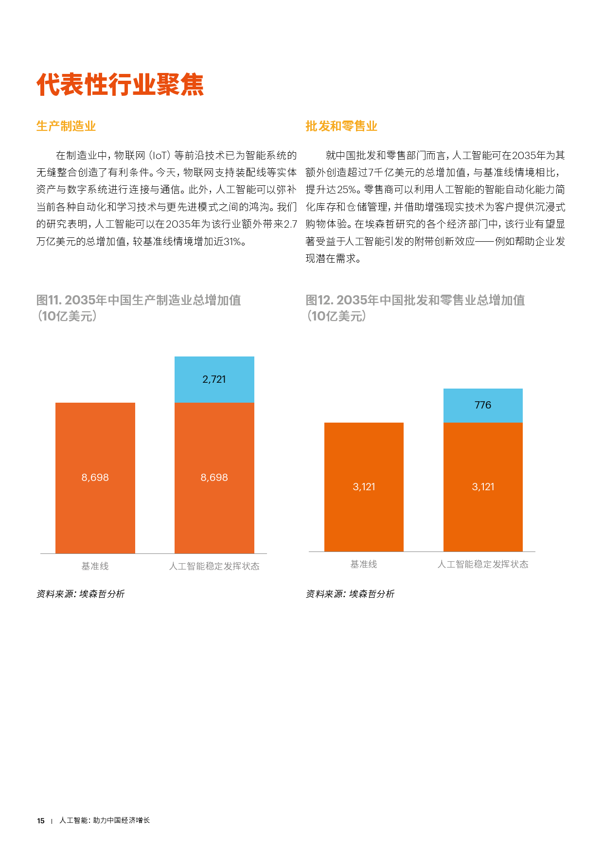 基于人工智能对中国经济整体影响的模拟分析,并结合行业规模数据,埃森哲进一步解读了人工智能对中国15个行业可能带来的经济影响。研究显示,制造业、农林渔业、批发和零售业将成为从人工智能应用中获益最多的三个行业。到2035年,人工智能将推动这三大行业的年增长率分别提升2%、1.8%和1.7%。