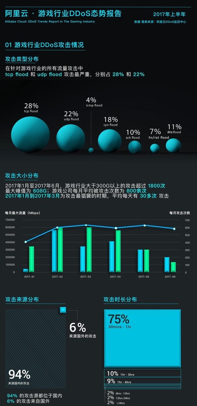 日前,阿里云发布2017年上半年的“游戏行业DDoS态势报告”。报告显示,2017年1月至6月,游戏行业大于300G以上的攻击超过1800次,最大峰值为608G;游戏公司每月平均被攻击次数为800余次。在2017年1月至3月为攻击最猖獗的时期,平均每天有30多次攻击。