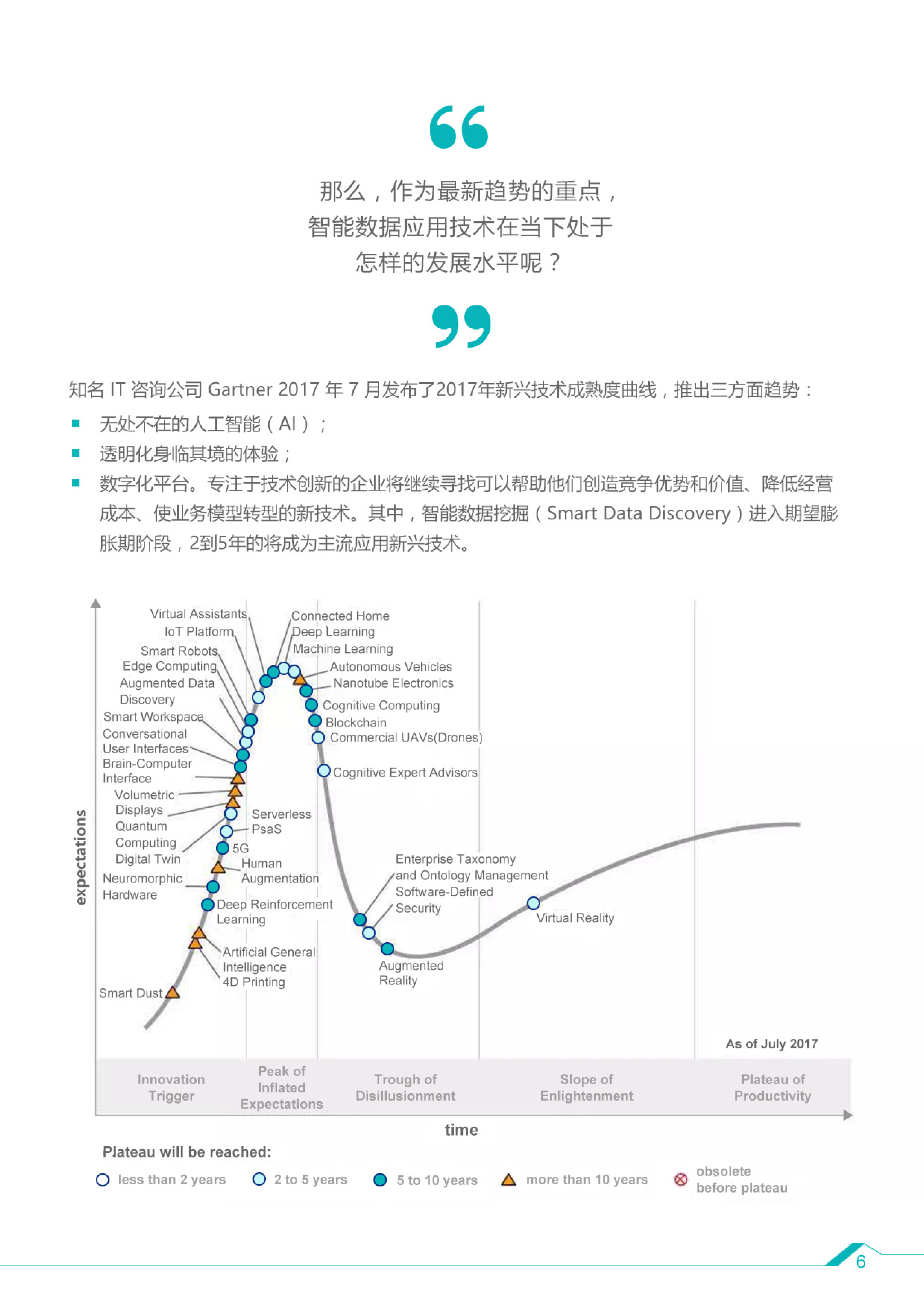 根据知名 IT 咨询公司 Gartner 7 月发布了2017年新兴技术成熟度曲线。推出三方面趋势: (1)无处不在的人工智能(AI);(2)透明化身临其境的体验;(3)数字化平台。专注于技术创新的企业将继续寻找可以帮助他们创造竞争优势和价值、降低经营成本、使业务模型转型的新技术。其中,智能数据挖掘(Smart Data Discovery)进入期望膨胀期阶段,2到5年的将成为主流应用新兴技术。