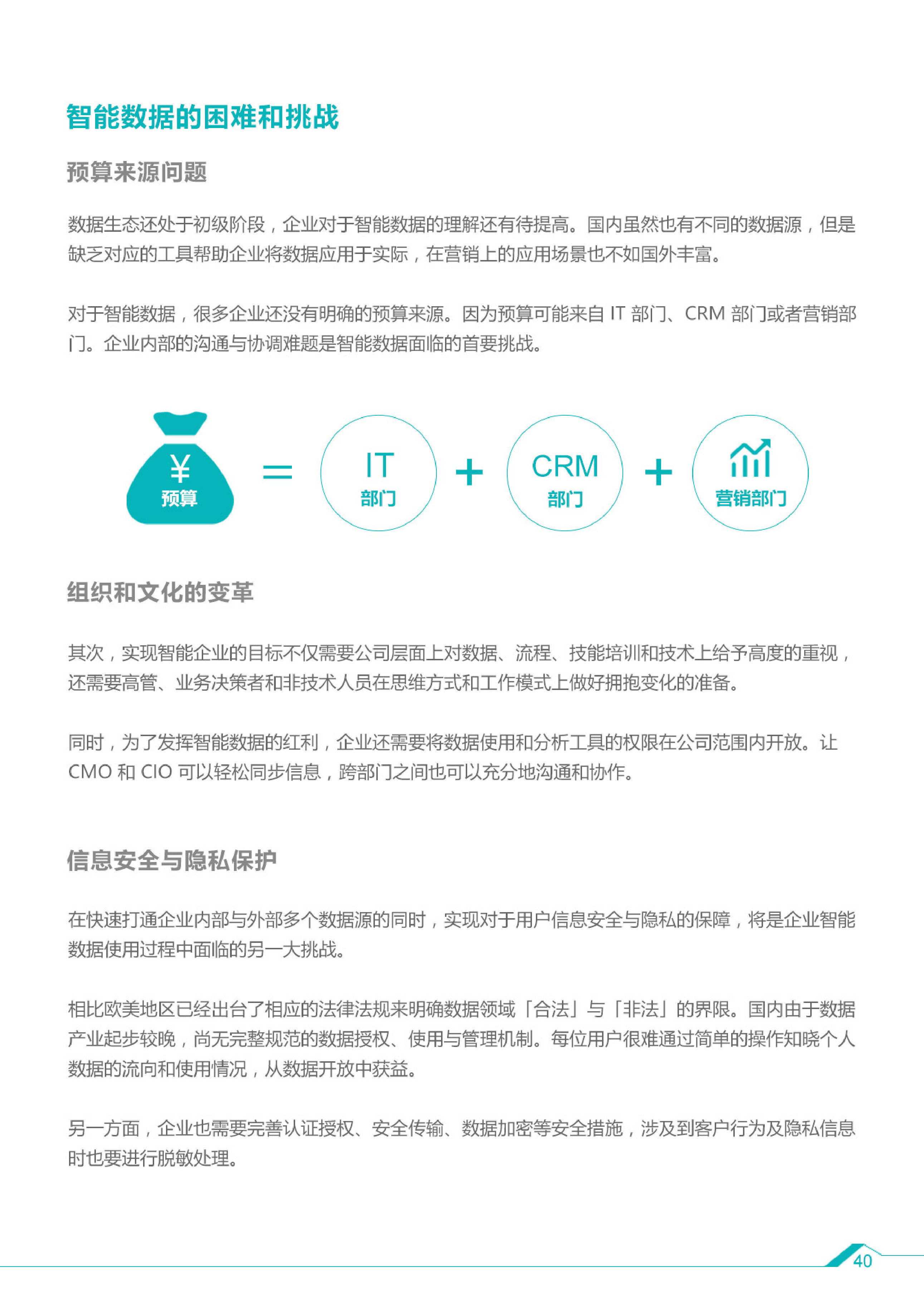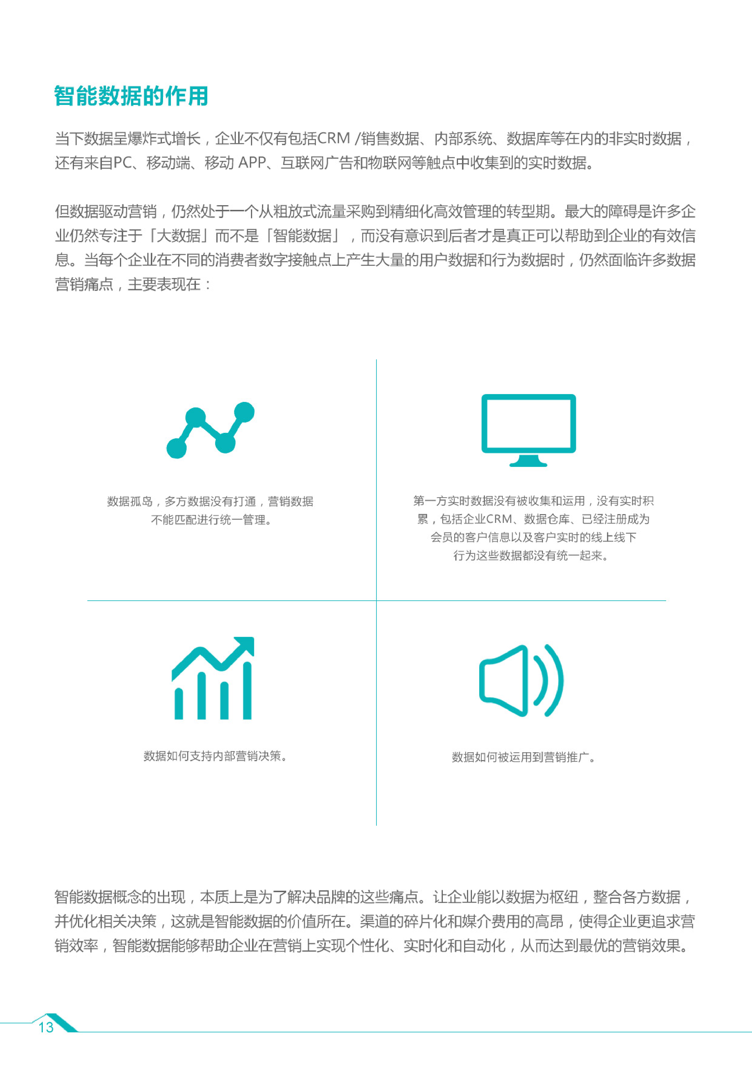 智能数据是指那些真正能够应用于解决实际问题的大数据子集,通过对结构化和非结构化的数据的整合、分析和激活,帮助企业做出正确的决策,提升营销效果和实现商业目标。