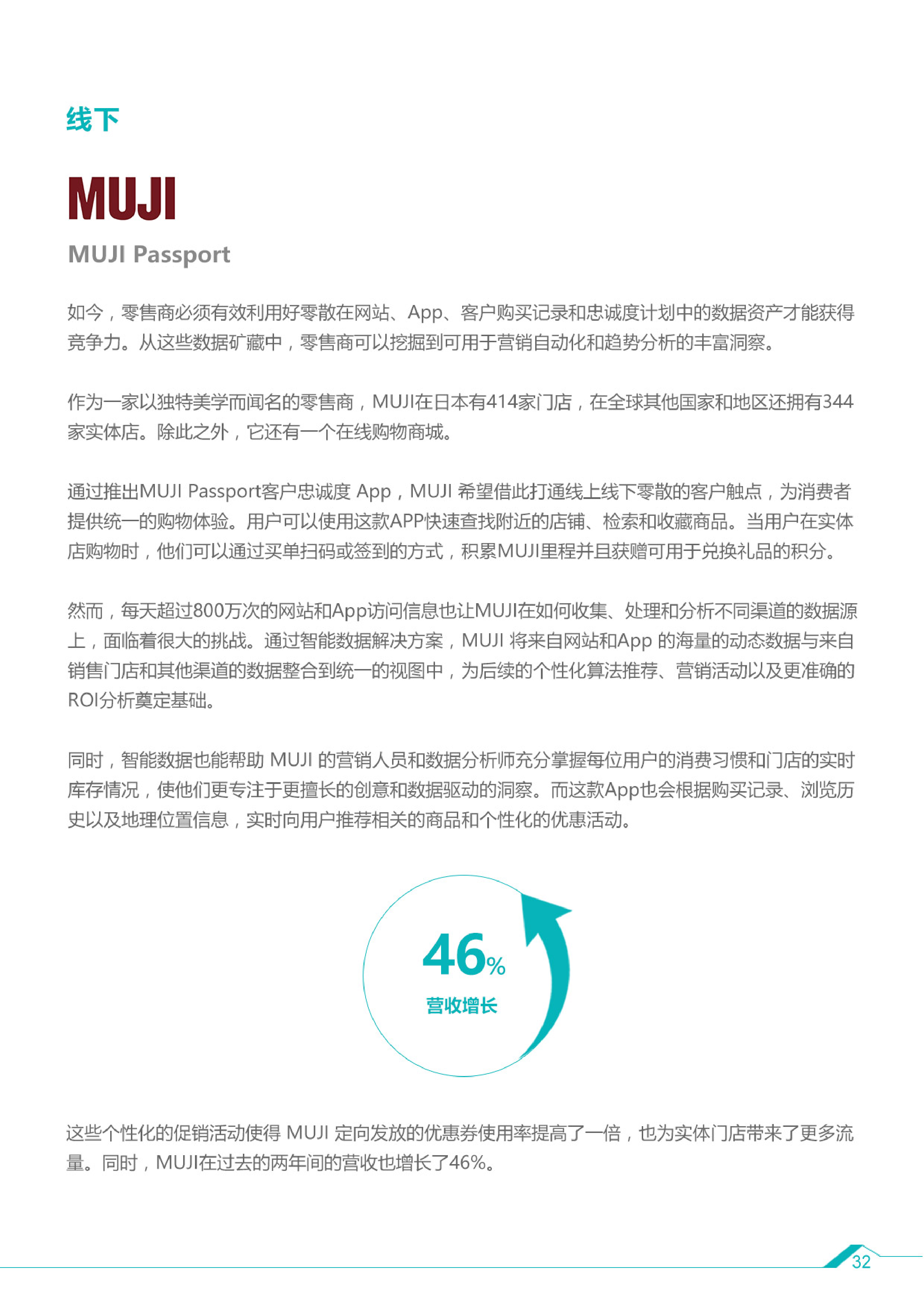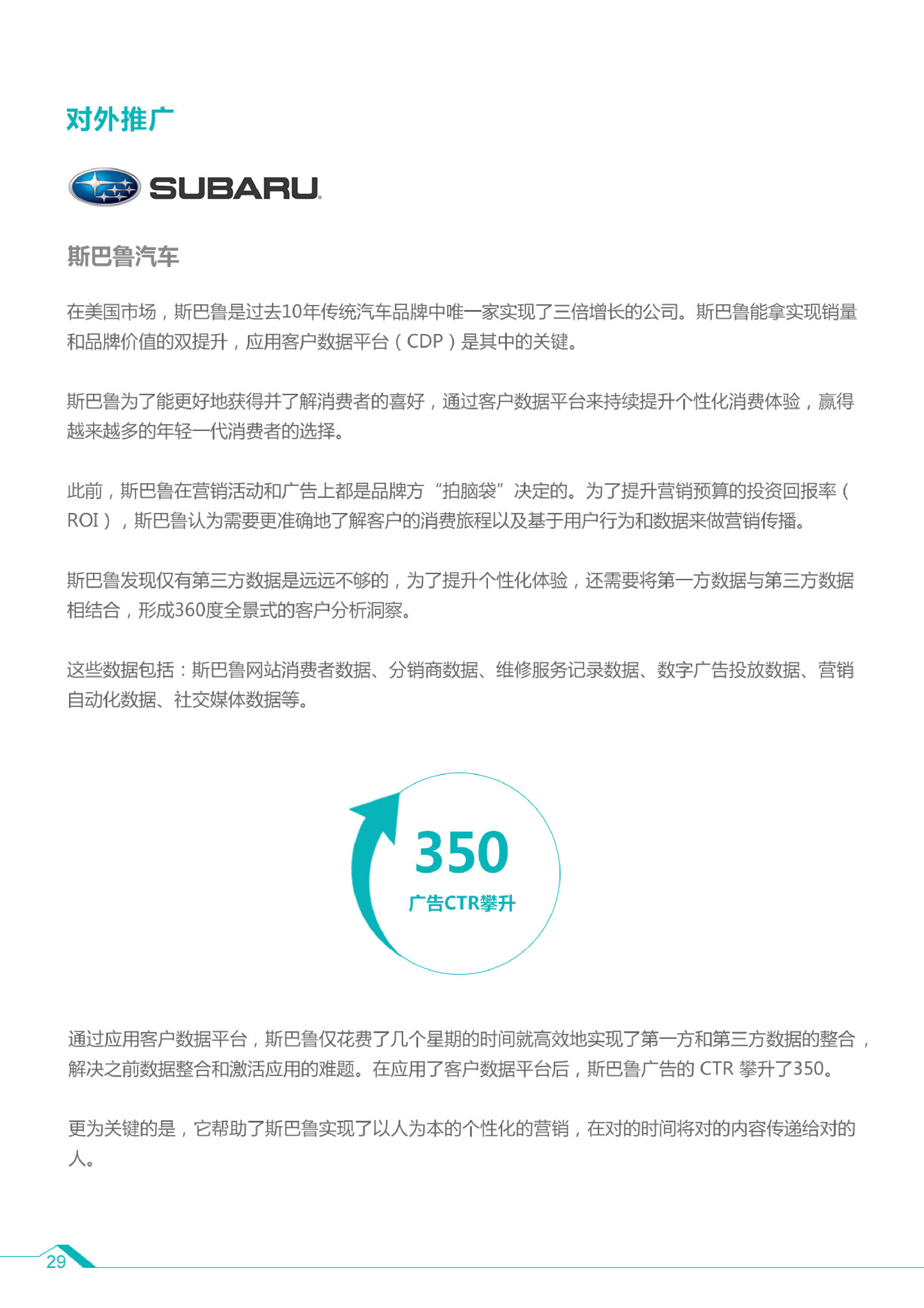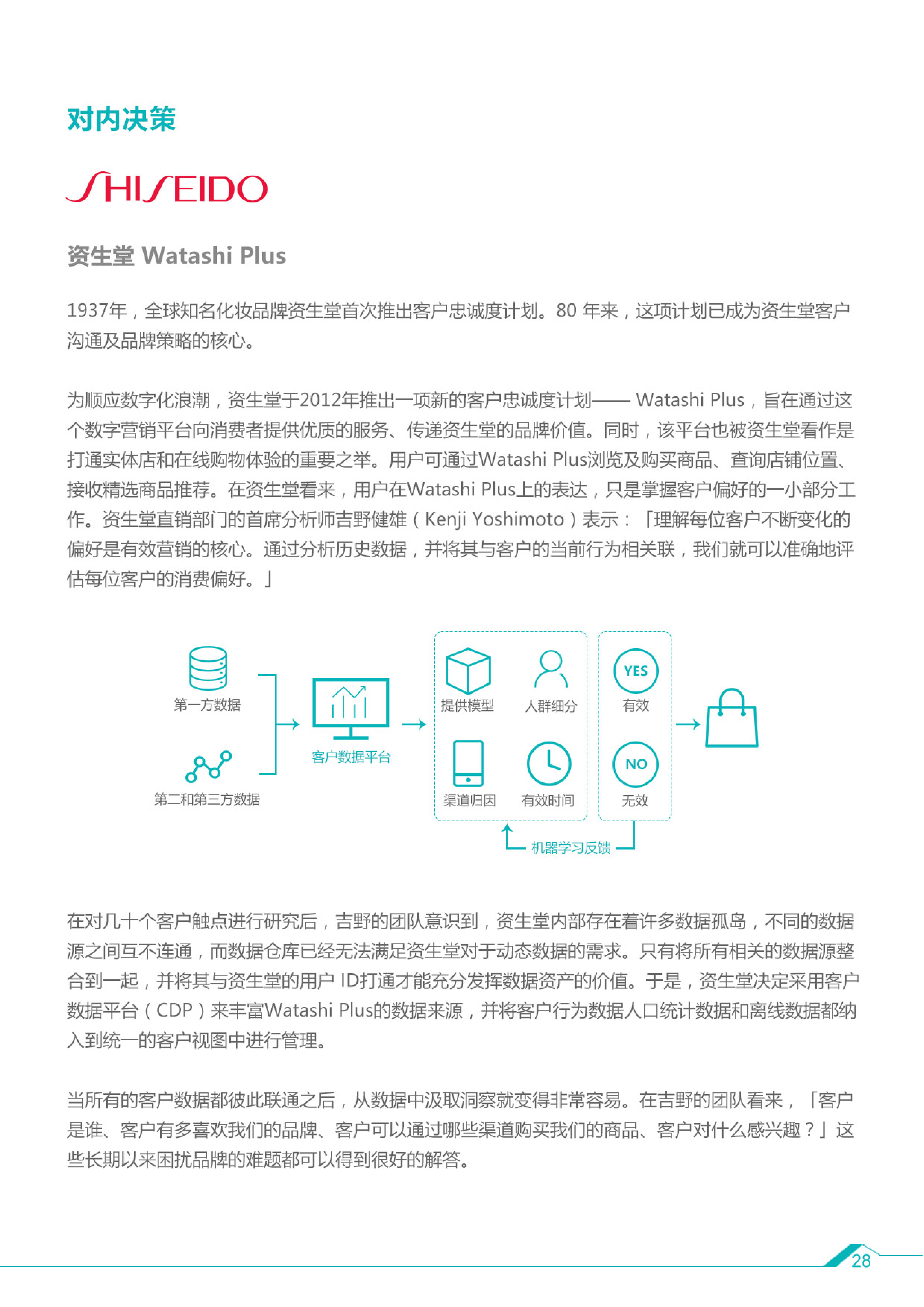 白皮书同时也对可口可乐、资生堂、斯巴鲁汽车、Wish、荷兰皇家航空和亚马逊等领先品牌线上线下、对内决策对外推广的智能数据实践做了比较详细的介绍:
