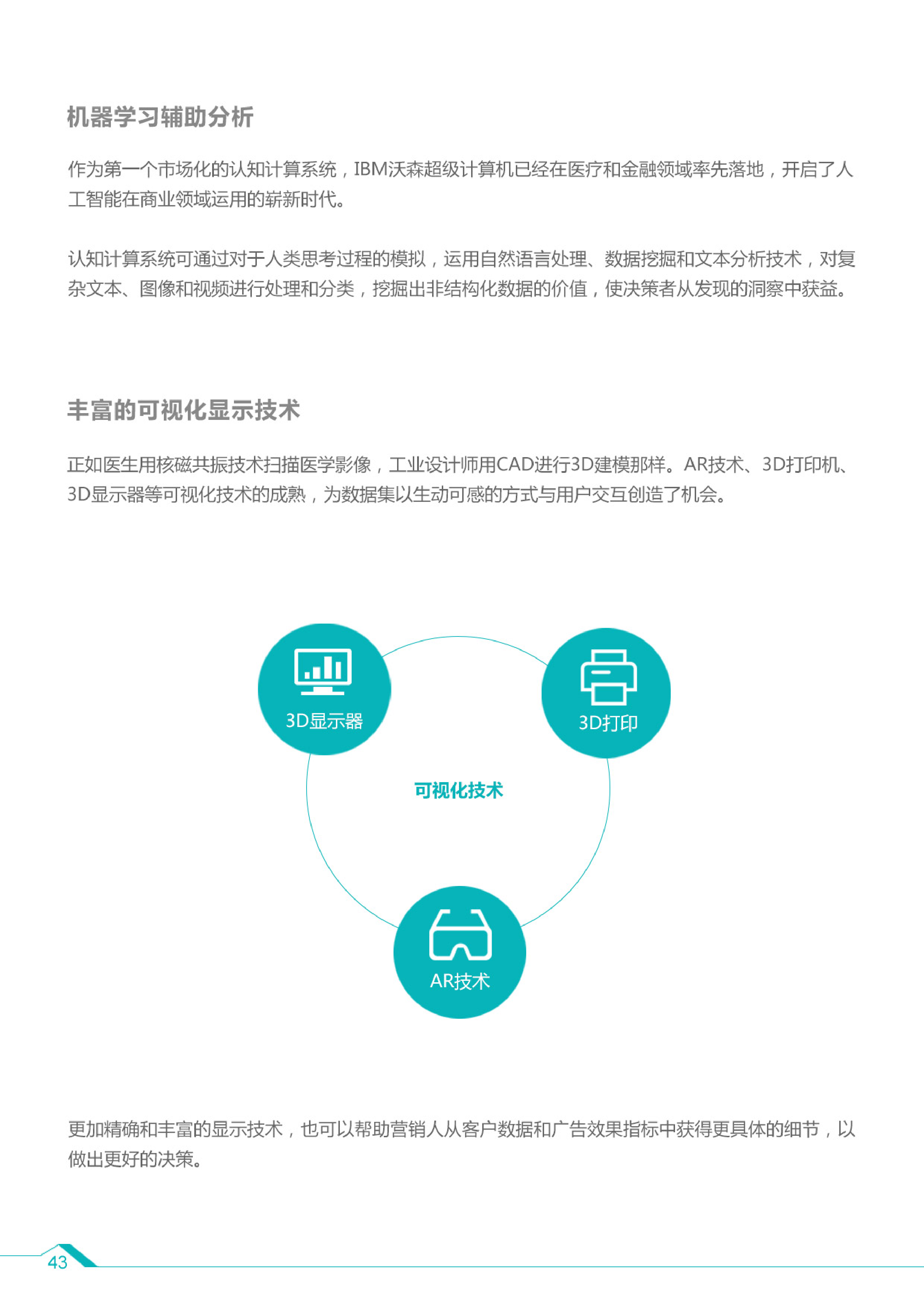 所谓「智能数据」是指那些真正能够应用于解决实际问题的大数据子集。在智能数据的运用上,企业面临的最大难题包括:数据收集、整合与分析以及实现数据应用的闭环。国外像亚马逊、可口可乐、荷兰皇家航空等公司其实已经在对内决策、对外的数据驱动营销以及客户体验的提升和优化上有了较为领先的智能数据实践。