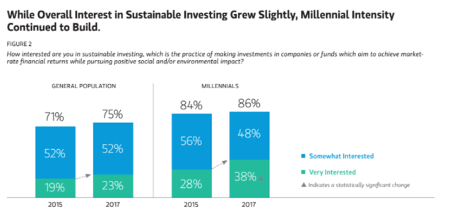 自2015年以来,“千禧一代”对可持续投资的兴趣一直在增加。从2015年到2017年,他们对可持续投资的兴趣从84%增至86%,期间那些声称自己对影响力投资非常感兴趣的人增加了10个百分点,达到38%。
