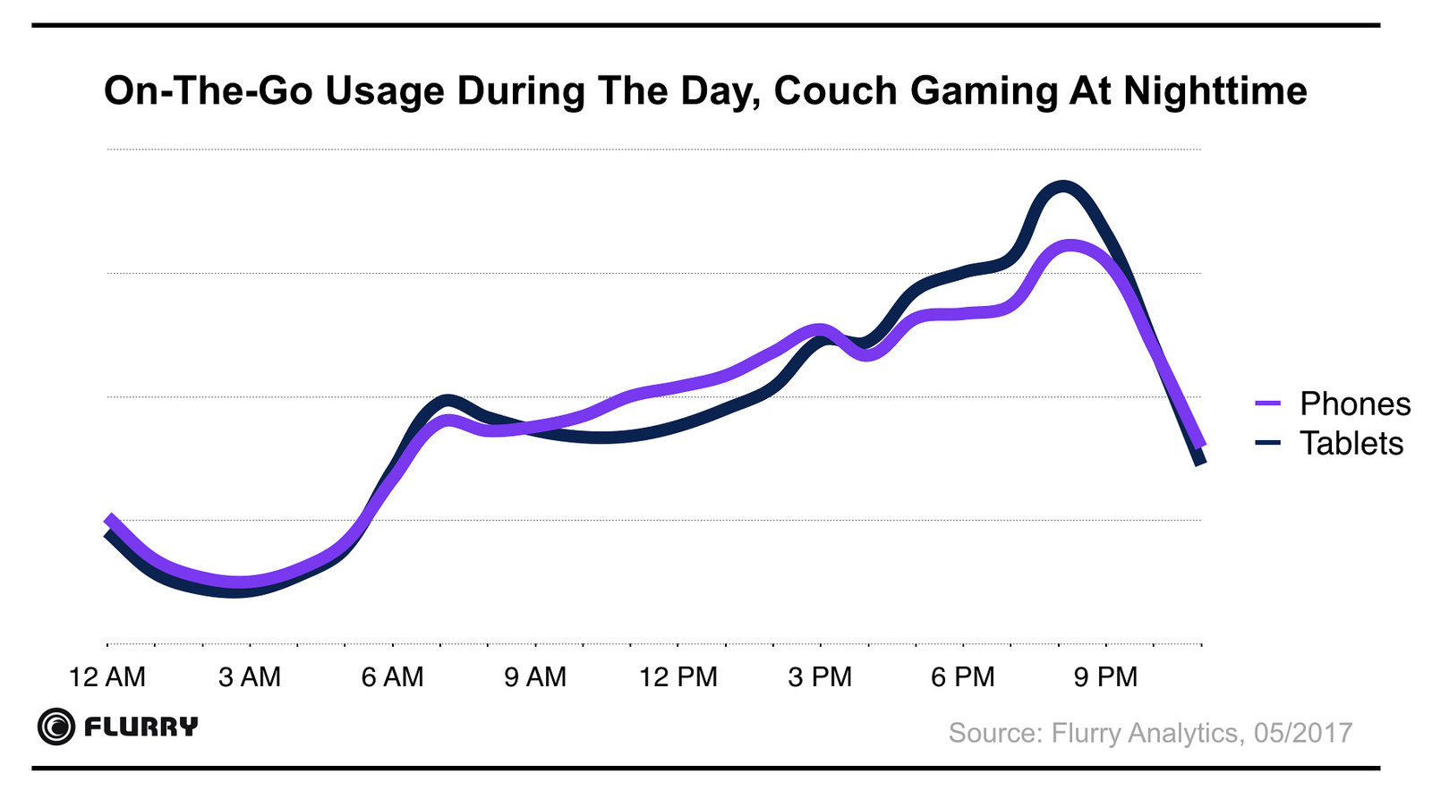 平板电脑游戏高峰在上午,而手机游戏的高峰则通常是在通勤和晚上。