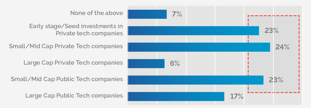 投资者仍然偏爱小型股或早期阶段的公司。调查涵盖了公共大盘科技公司、私人大盘科技公司、公共中小型企业,私人中小型科技公司和早期/种子投资的偏好。71%的受访投资者选择小公司——私人或公共中小型公司及早期阶段科技公司。