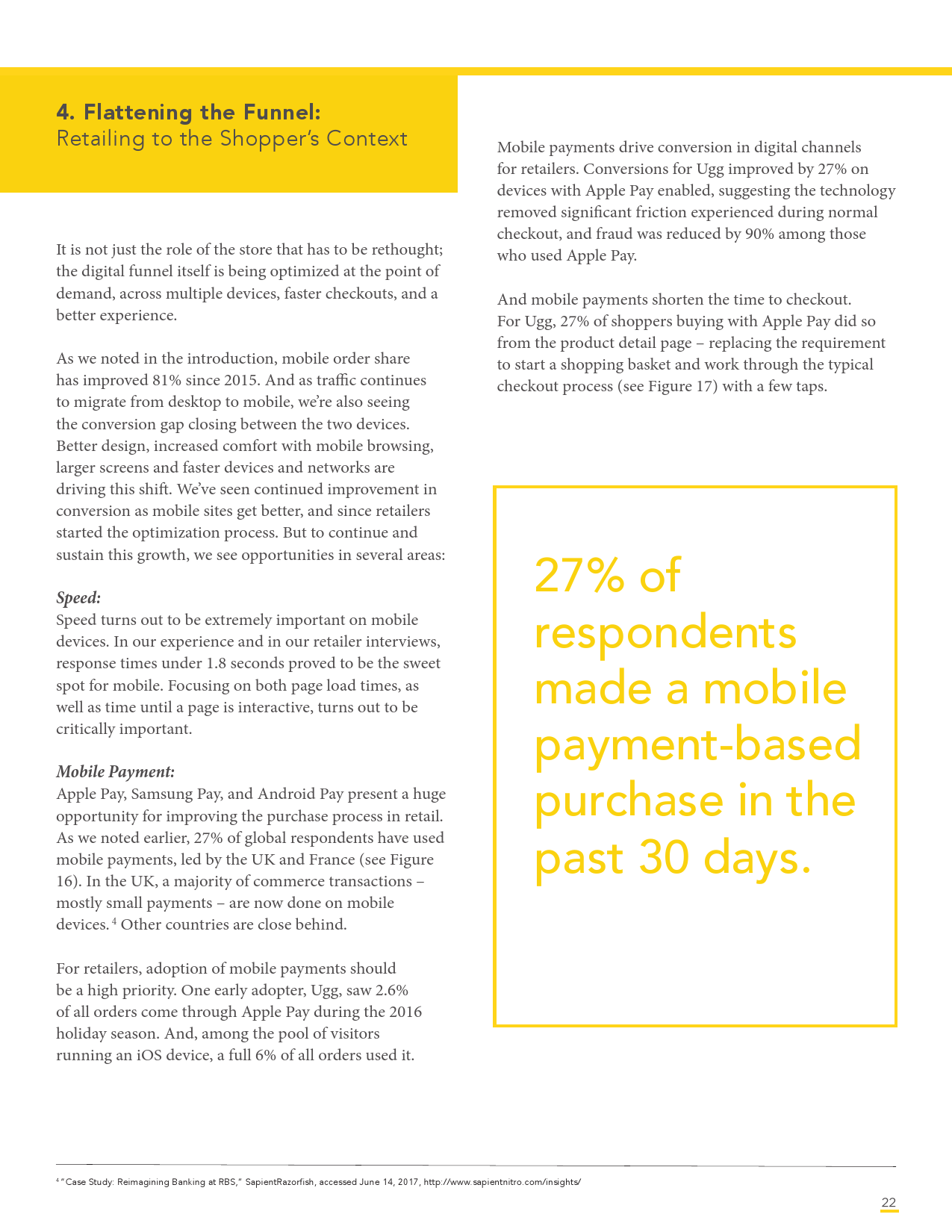 3. 移动端:数字指南针。移动支付选项继续推动着转化。例如Apple Pay一类的移动支付已非常有效地将单个零售伙伴的转化率提升至27%。