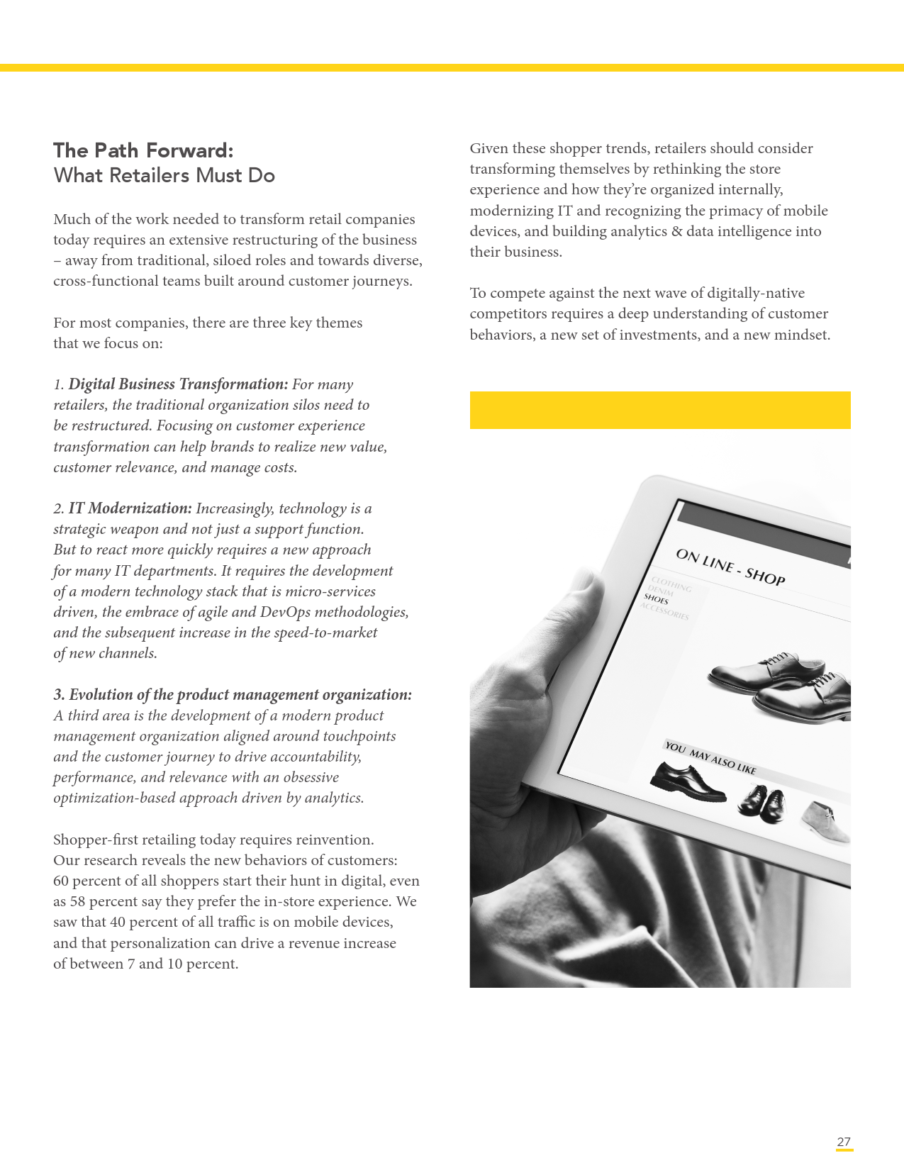 这份研究报告特别指出了购买行为影响的三个主要领域:服饰,家庭用品,健康与美容,此时重新评估传统策略和战术,对首席执行官,首席营销官和高管级别的零售管理者来说是一个巨大的压力,着重强调了向以消费者体验旅程为中心而打造的多功能团队转型,重构商业业务的需求正在不断增加。分析中揭示了四大战略性方面,共同构建以消费者为中心,购买者优先的零售基础: