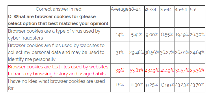 另外,Digital Media Stream还调查了消费者对各渠道的了解程度。18-24岁的网民对网络营销渠道的了解程度最高,54%非常了解浏览器cookies的工作原理。55岁以上网民对网络营销渠道的了解程度最低。