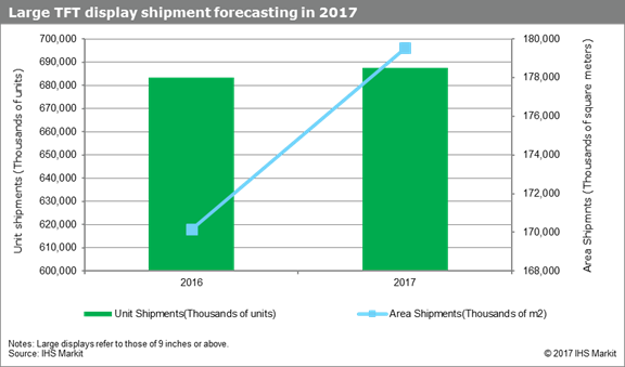 IHS Markit预测,尽管终端市场需求放缓,2017年大尺寸薄膜晶体管(TFT)显示器市场预计将继续扩大。