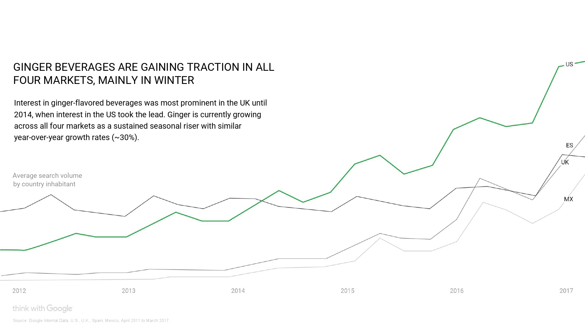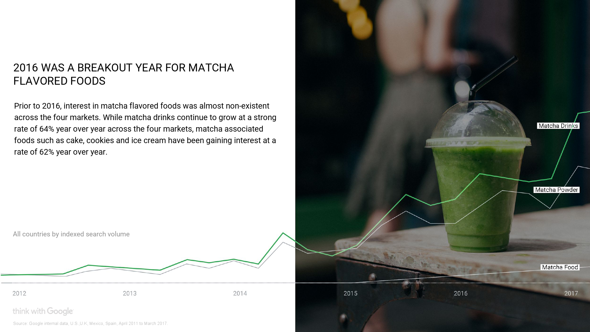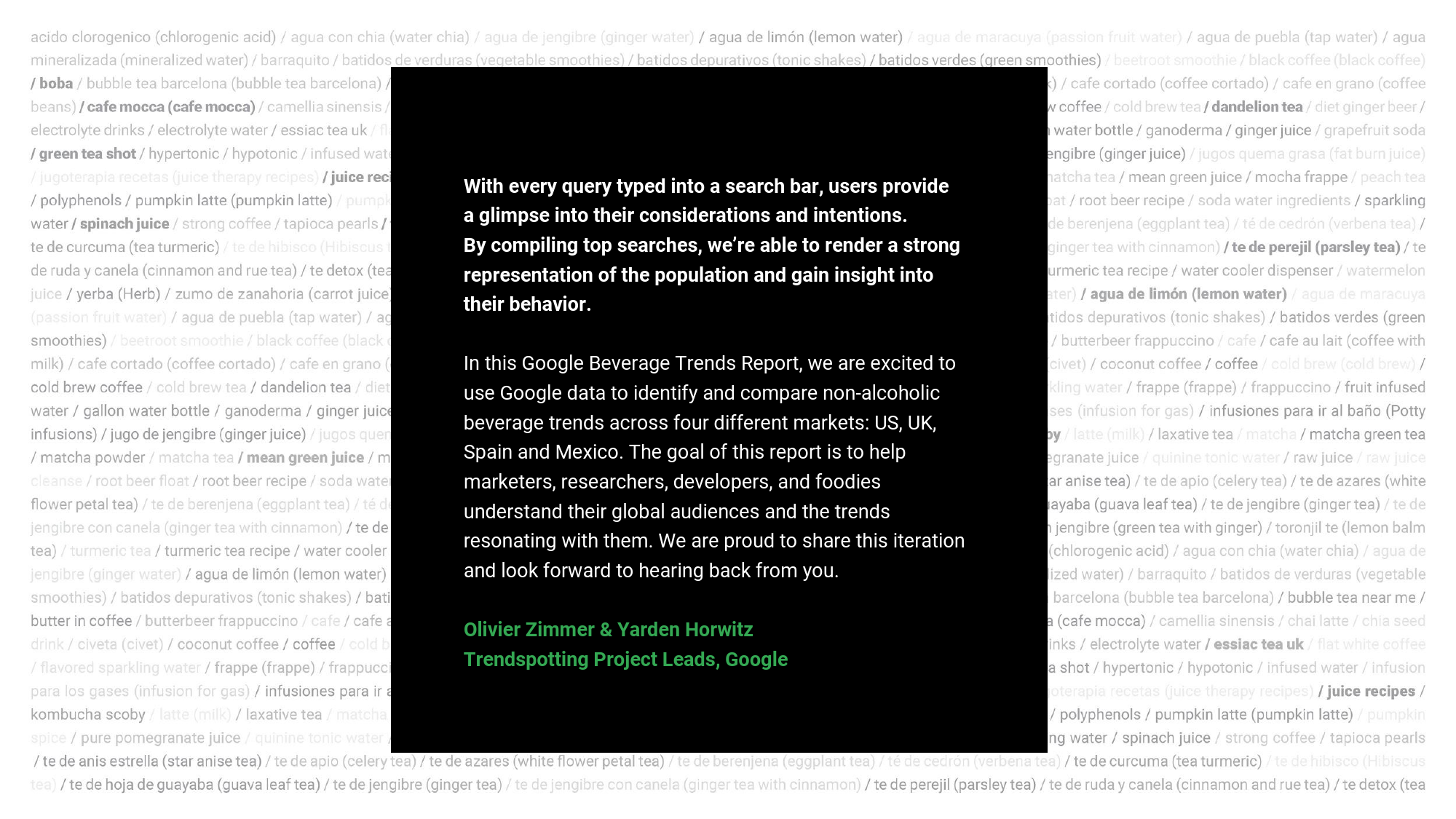 在这个研究中,谷歌先调取了美国、英国、西班牙和墨西哥四个国家的网络用户在2015年4月-2017年3月间使用谷歌搜索的热门饮料词条,总结出主要的搜索趋势;再对这些热门词剔除季节性影响后,算出它们搜索量的年同比增幅、速率和加速情况。