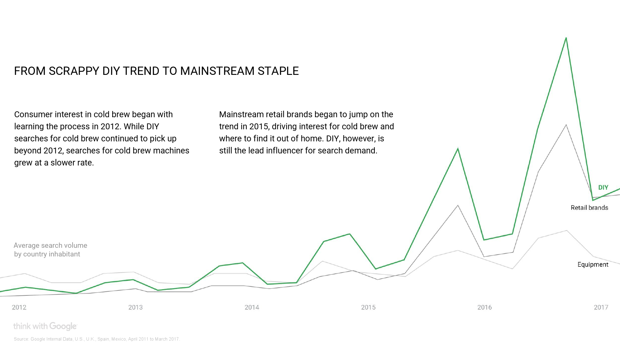 很多人可能以为,是星巴克等一波咖啡零售品牌带火了这个新商品。但谷歌通过搜索数据发现,冷萃咖啡得以走红,其实和2012年手工制作咖啡的盛行不无关联。