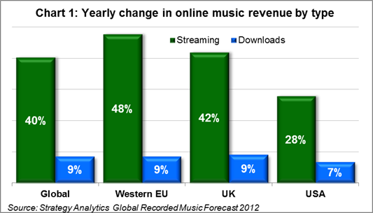 市场研究机构Strategy Analytics今天发布的一份报告显示:2012年,全球数字音乐收入增长了40%,而音乐下载量只增长了9%,只相当于前者的五分之一。