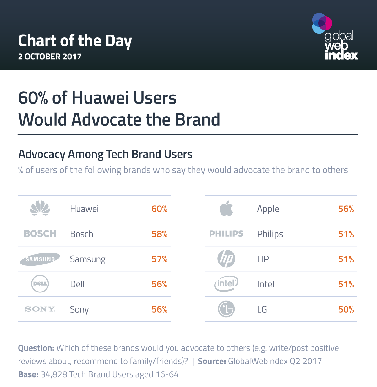 GWI针对16家科技公司进行了调查,华为是品牌宣传最积极的(60%)。GWI将品牌宣传定义为消费者为品牌写正面评价或向家人、朋友推荐品牌。