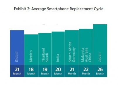 平均来说,全球用户每21个月更换一次手机,墨西哥平均只有18个月,而日本用户更换手机的时间达到了26个月。
