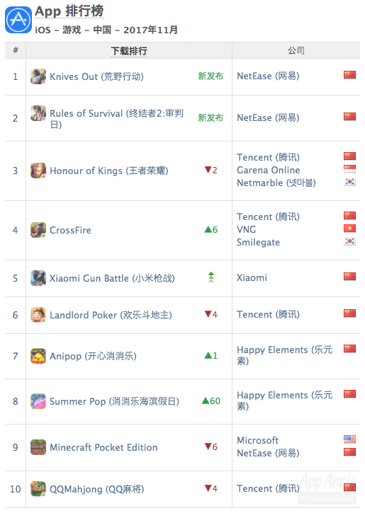 十一月中国 iOS 下载公司排行榜上,网易凭借两款“吃鸡”手游《Knives Out (荒野行动)》和《Rules of Survival (终结者2:审判日)》再度上升两位,紧靠腾讯排名第二。公司收入方面,快手挤进前三,增长最为明显的是万达院线,这也主要得力于旗下胡莱游戏的营收贡献。
