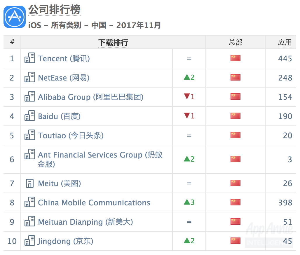 下图:2017 年 11 月中国 iOS 下载量最大的发行商