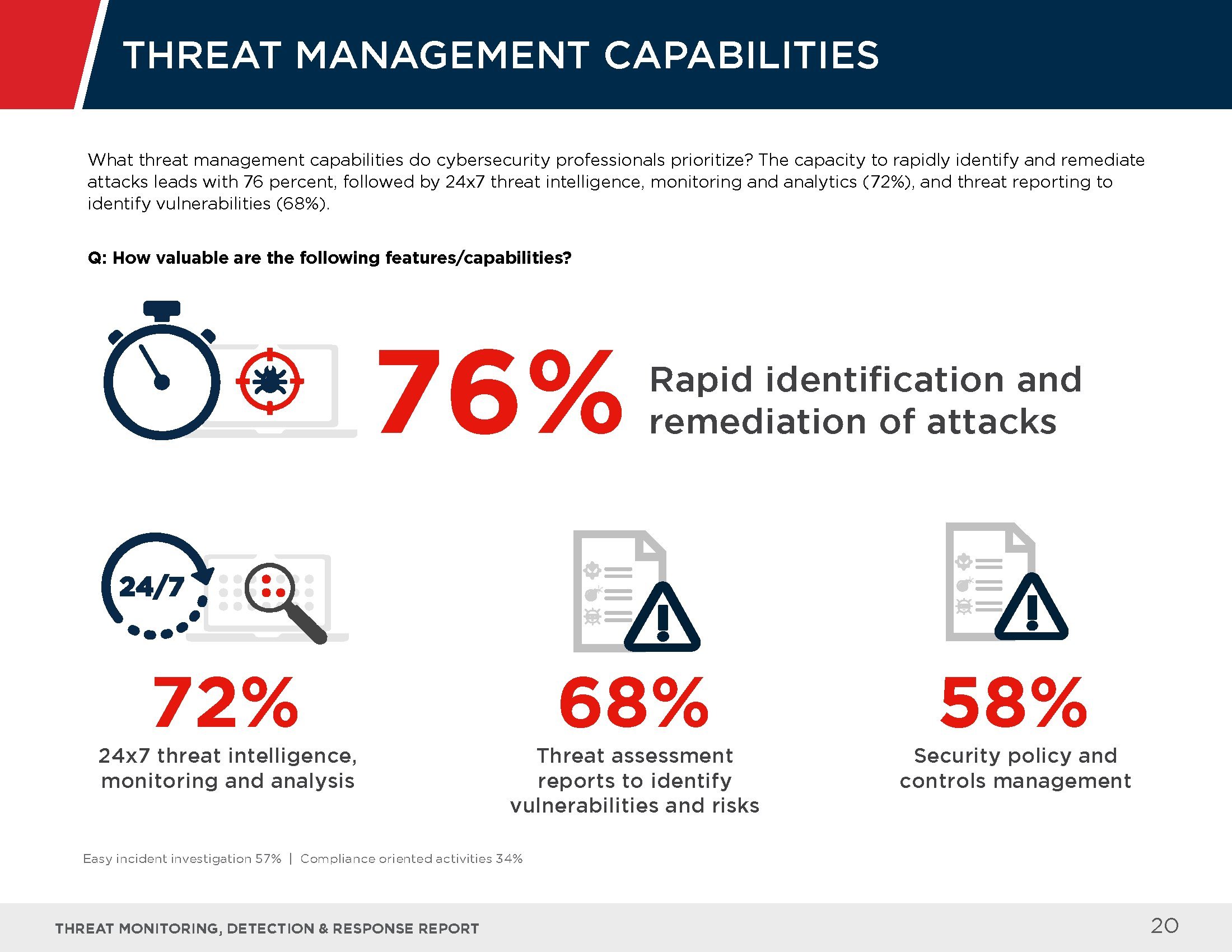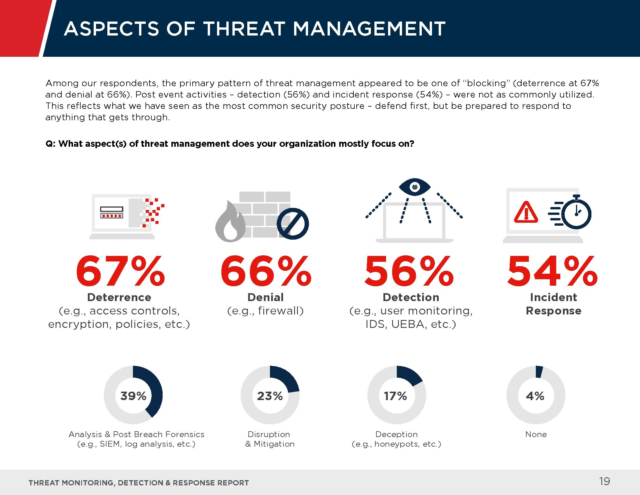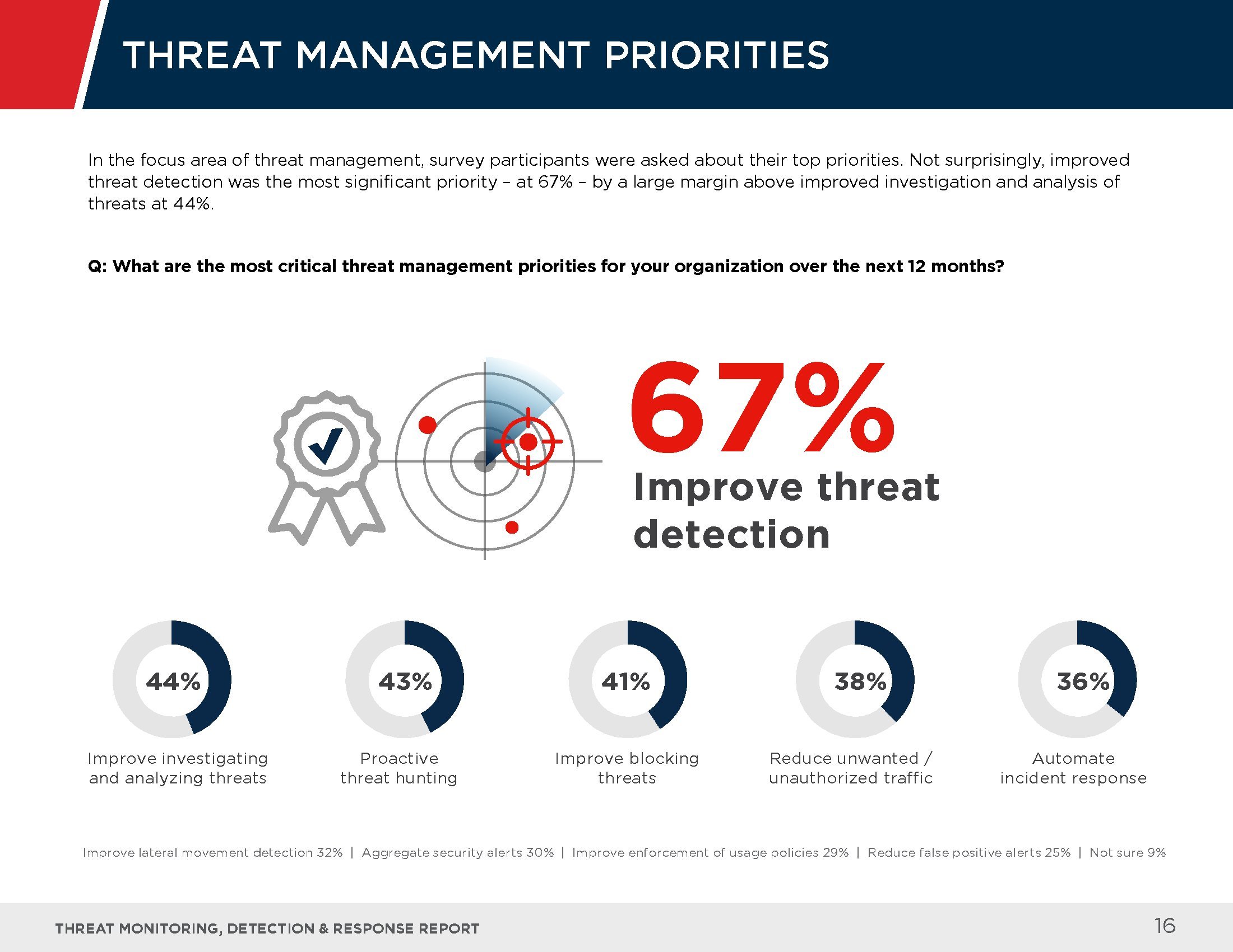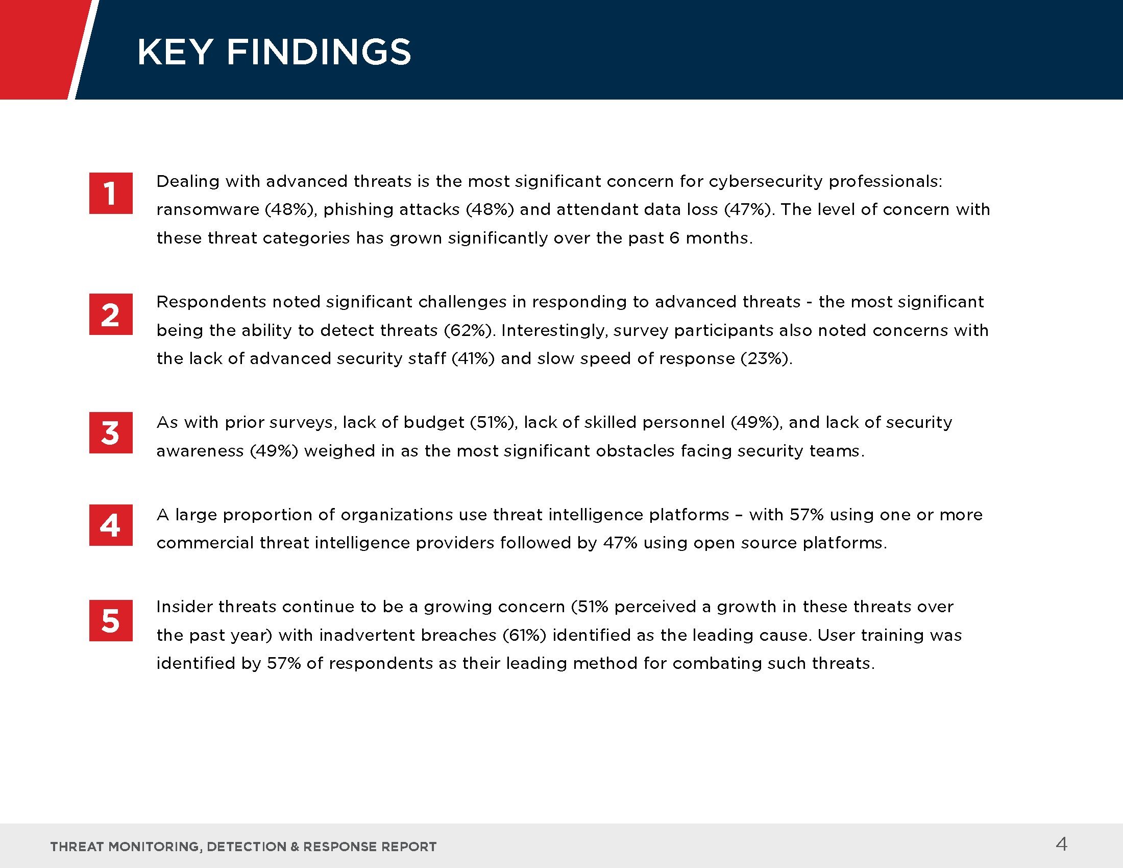 受访者指出了应对这些高级威胁的最大挑战,其中包括检测威胁的能力(62%)、缺乏先进的安保人员(41%),以及反应速度缓慢(23%)等。