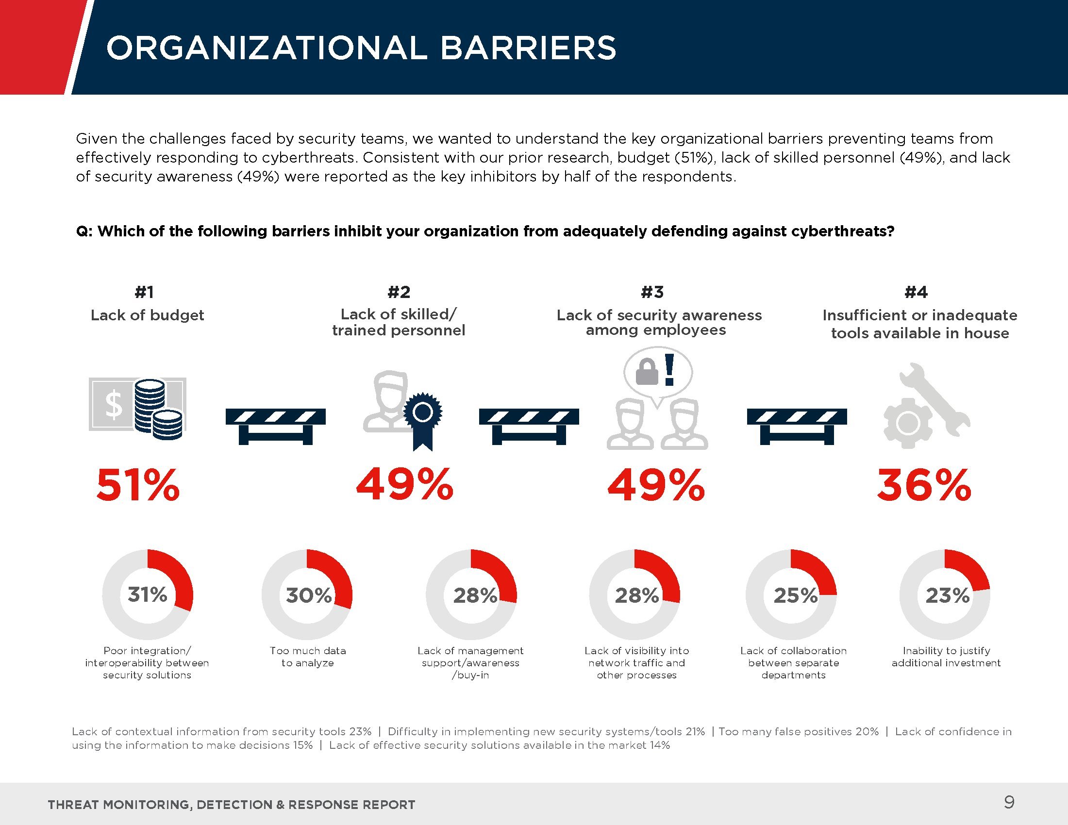 和之前的调查一样,缺乏预算(51%)、缺乏技术人员(49%)和缺乏对安全性的认识(49%)则是安全团队面临的重要障碍。