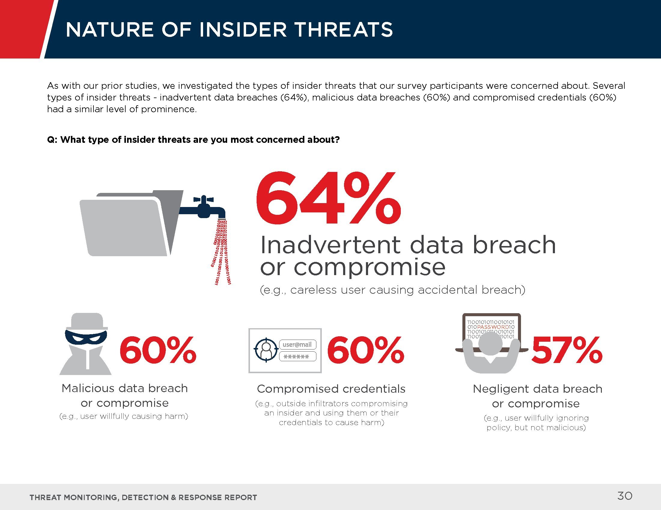内部威胁日益受到关注,51%的受访者认为这种威胁在过去一年有所增长,而无意的违规事件(61%)则是导致内部威胁的主要原因。57%的受访者认为用户培训是战胜内部威胁的主要手段。