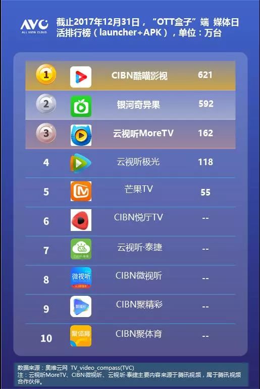 一、智能电视+OTT盒子端,OTT视频媒体综合日活榜
