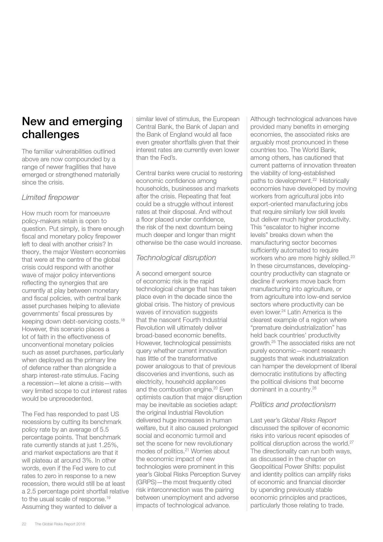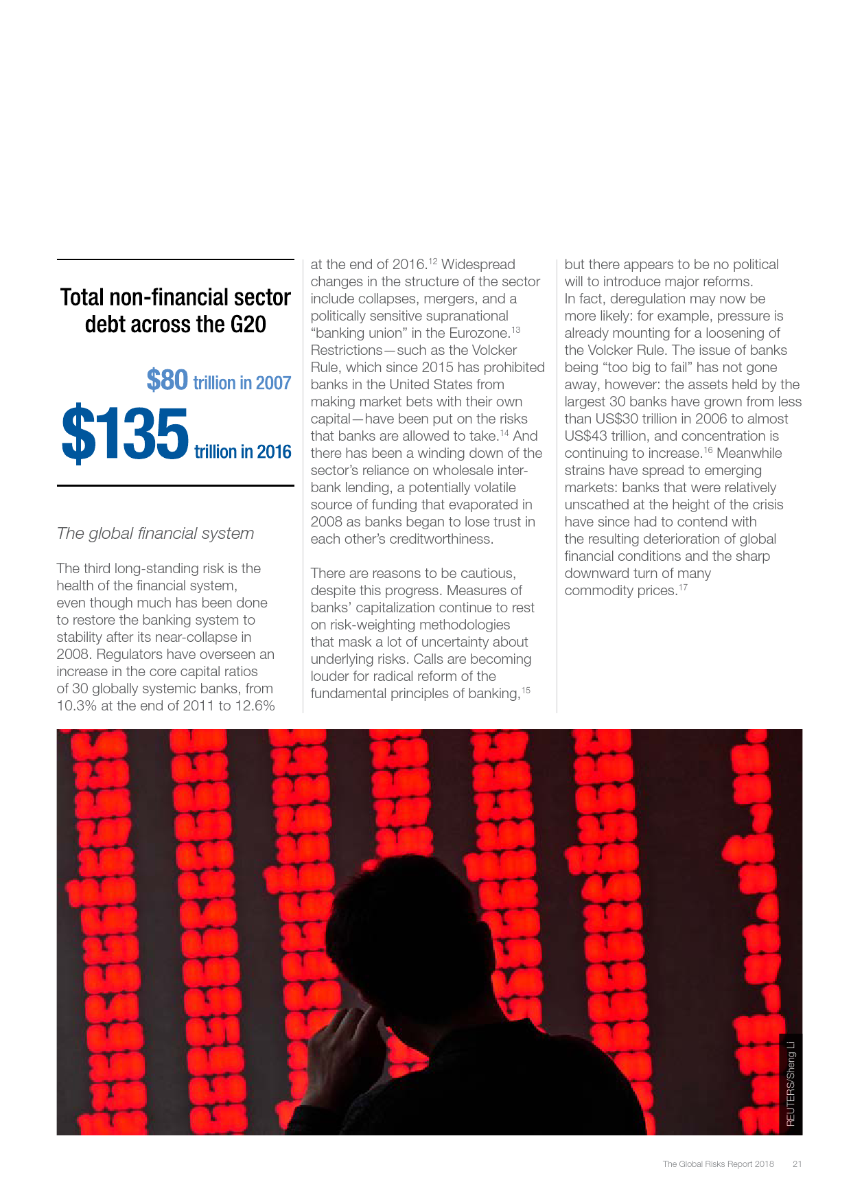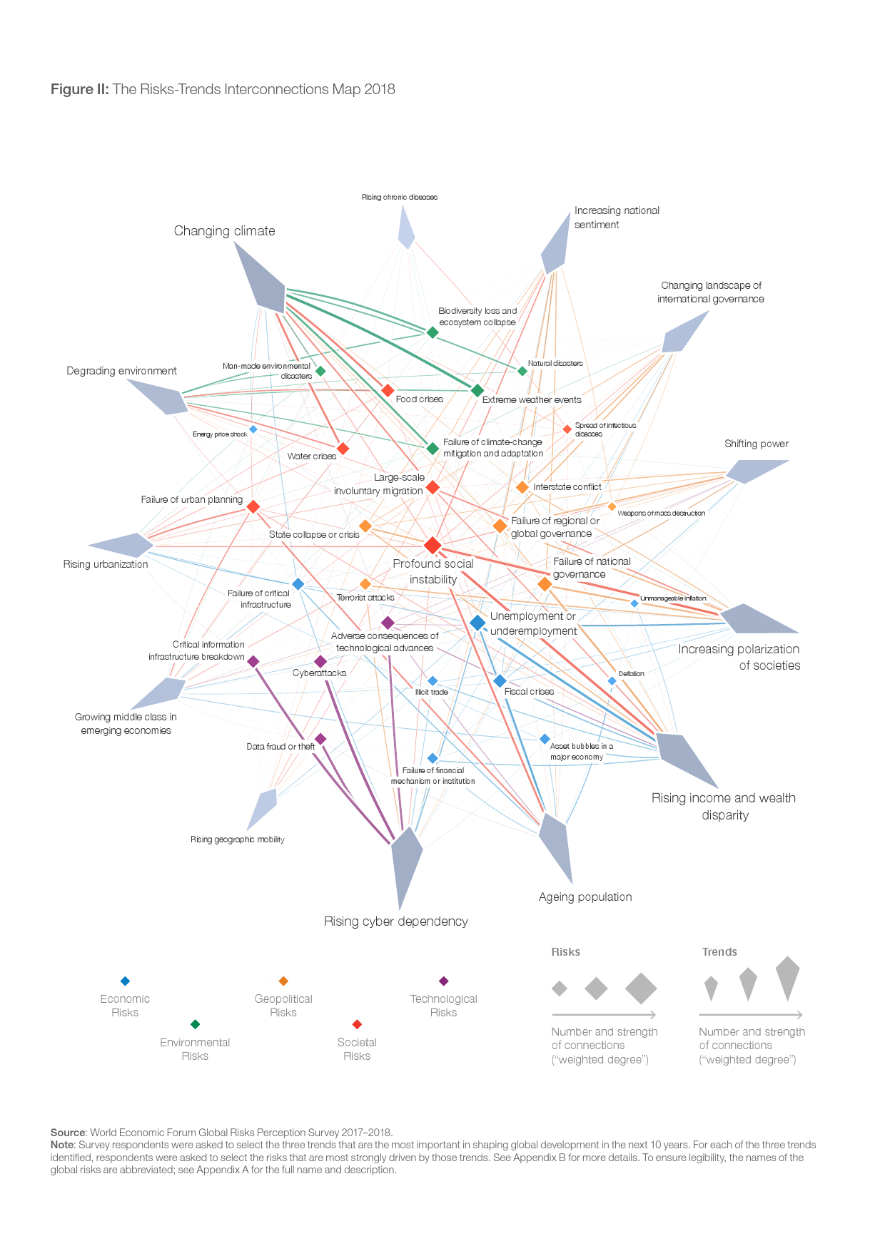 2018年的报告还展示了我们最新的全球风险感知调查的结果,在这一调查中,近1000名专家和决策者评估了30个全球风险在10年时间内的可能性和影响。在这个中期,环境和网络风险占主导地位。然而,该调查也突显了人们对2018年风险轨迹的担忧,尤其是在地缘政治紧张局势方面。