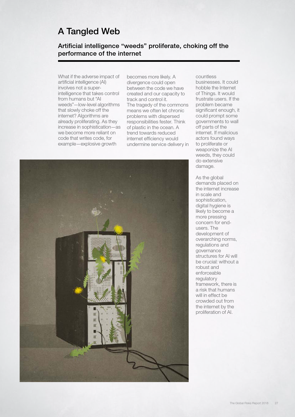 今年的报告所涉及的风险比以往任何时候都多,但重点是四个关键领域:环境恶化、网络安全漏洞、经济紧张和地缘政治紧张。在一个名为“未来冲击”的新系列中,该报告告诫人们不要自满,并强调必须为突然和剧烈的混乱做好准备。