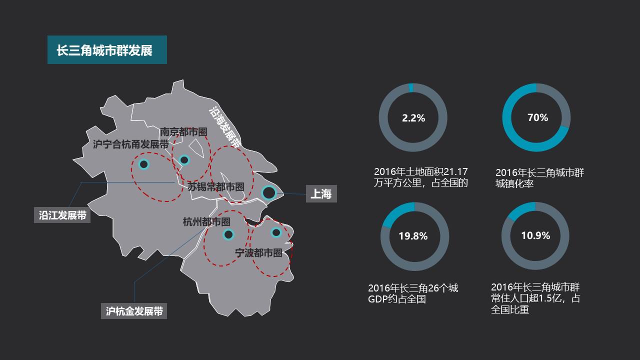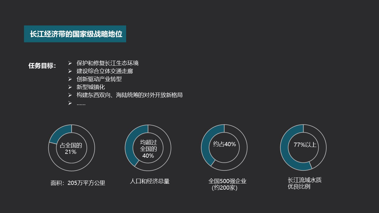 “长江经济带”、“一带一路”、“长三角城市群”国家战略,为长三角带来发展改革红利,迎来了前所未有的发展契机。长江经济带覆盖上海、浙江等11个省市,其人口和经济总量均超全国40%,全国500强企业约有200家,区域地位重要、综合实力较强、发展潜力巨大。