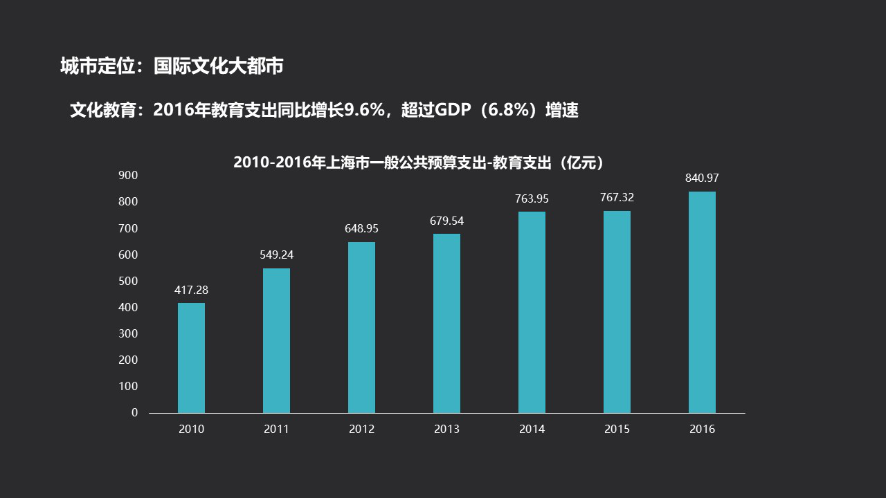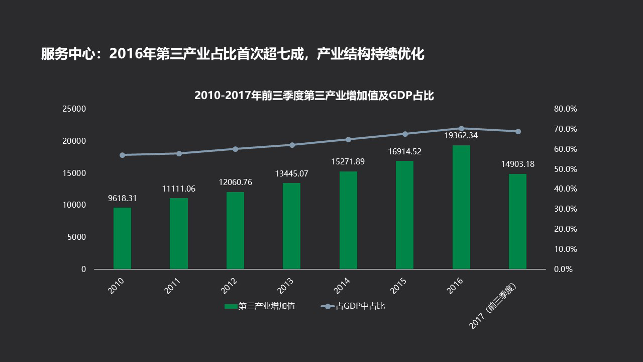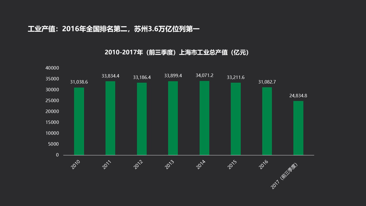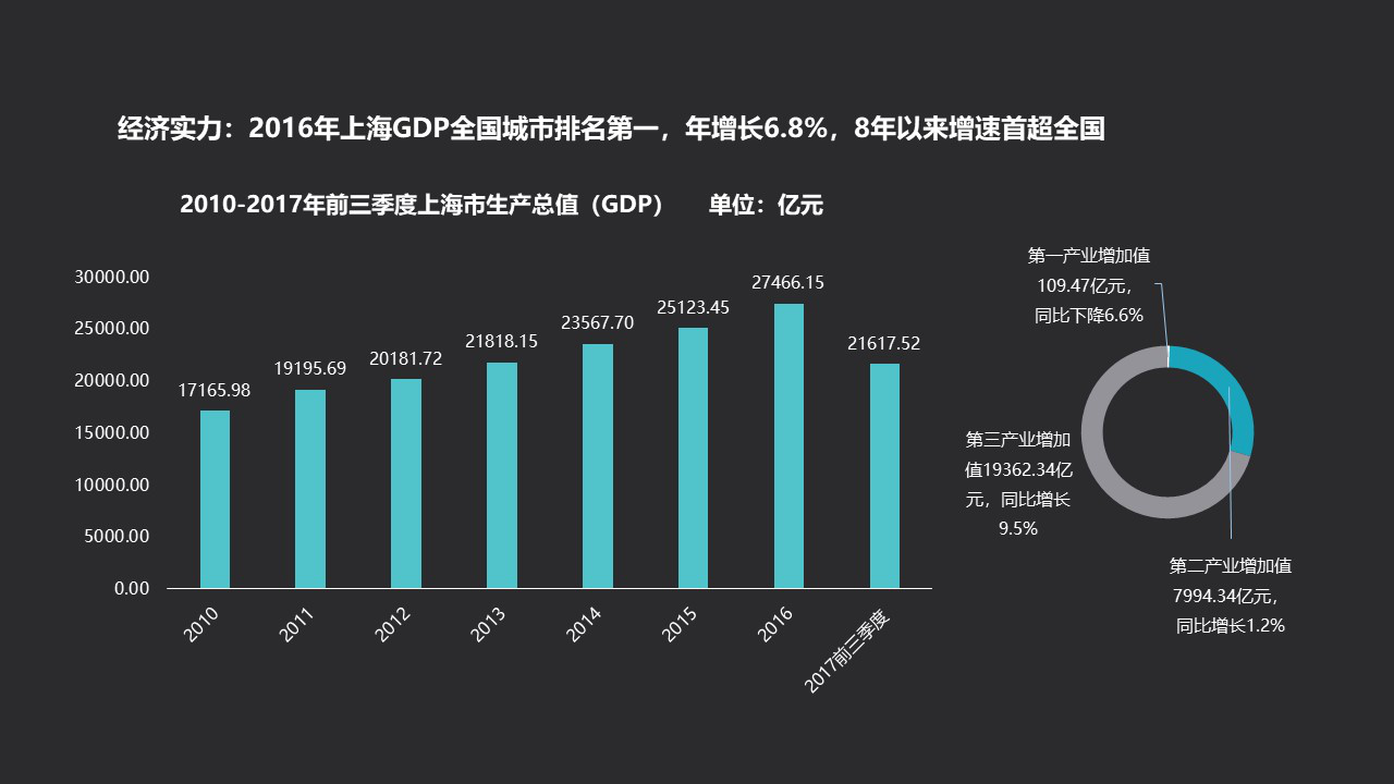 上海作为追求卓越的综合性全球城市,经济实力、创新能力均在全国处于领先地位。2016年,上海GDP总量达2.75万亿,全国城市排名第一,增速达6.8%。2016年,上海市进出口总额2.87万亿,约占全国的十分之一;货物吞吐量、集装箱吞吐量连续七年全球第一,国际贸易中心、国际航运中心地位进一步奠定。与此同时,第三产业占比首超七成,产业结构进一步优化。