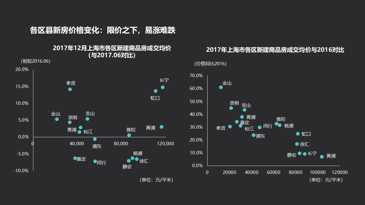 从住房成交情况来看,2017年各区二手房成交同比下滑,下滑幅度差异不大,在50%左右。价格方面,相较2016年,各区成交均价呈上涨趋势,且涨幅进一步分化,在20%~70%不等。从2017.12与2017.06的成交均价对比来看,各区均价小幅波动,幅度在-10%~15%之间。