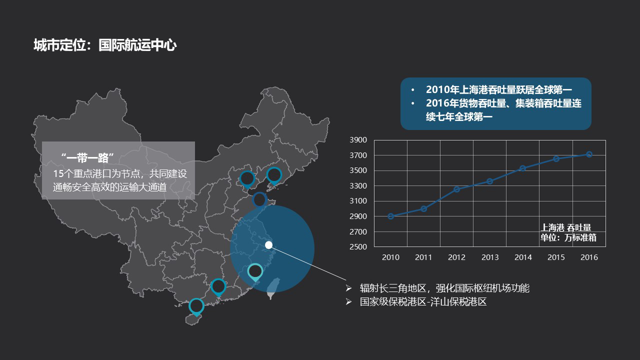 随着我国经济综合实力和国际地位不断提升,经济已经由高速增长阶段转向高质量发展阶段,经济的高速平稳运行,为上海参与全球竞争、提升城市能级带来重大契机。在国家“十三五”规划、“一带一路”、“长江经济带”等国家级战略规划的引导下,上海将充分发挥对外开放的辐射效应、枢纽功能和示范引领作用,增强国际竞争力。