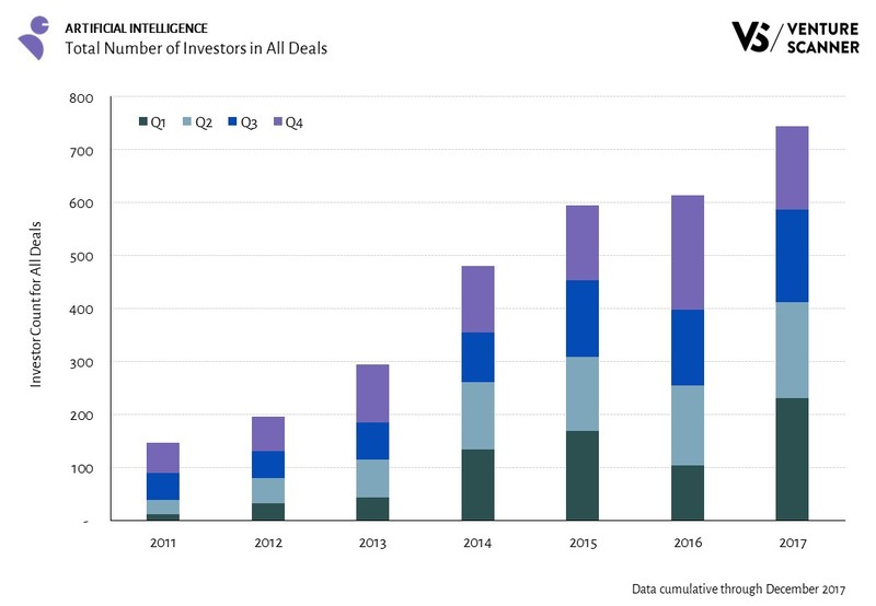 为了衡量投资者的兴趣,Venture Scanner追踪了AI投资者数量。例如,有5个投资者参与了一家AI公司的投资,另有4个投资者参与另一个投资,则投资者的兴趣度为9。过去六年,AI投资者的兴趣度复合年均增长率为31%,2017年同比增长21%。